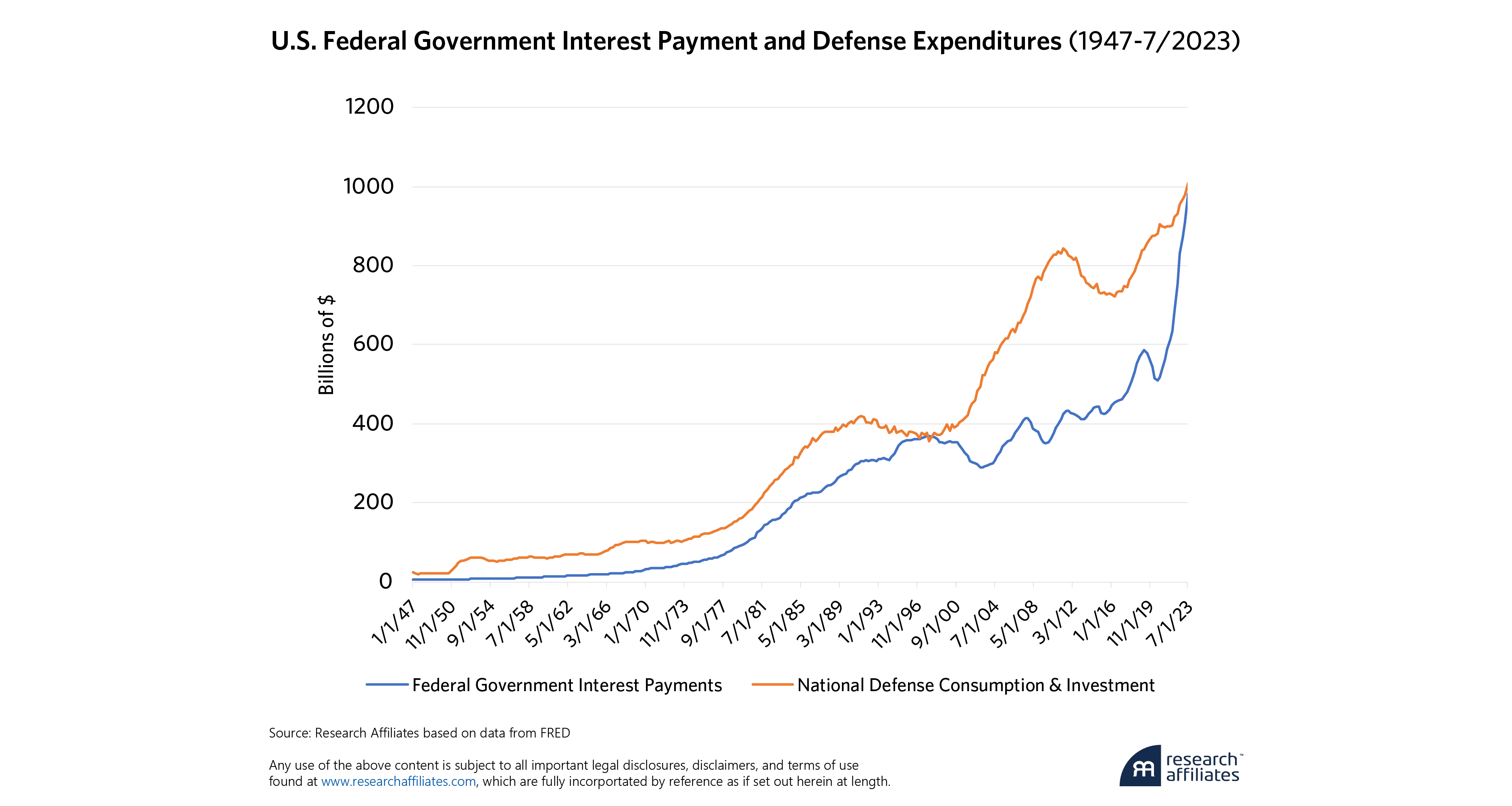 A 525-basis point hike in the fed funds rate has put interest expense on the national debt on a course to eclipse defense spending in coming quarters.