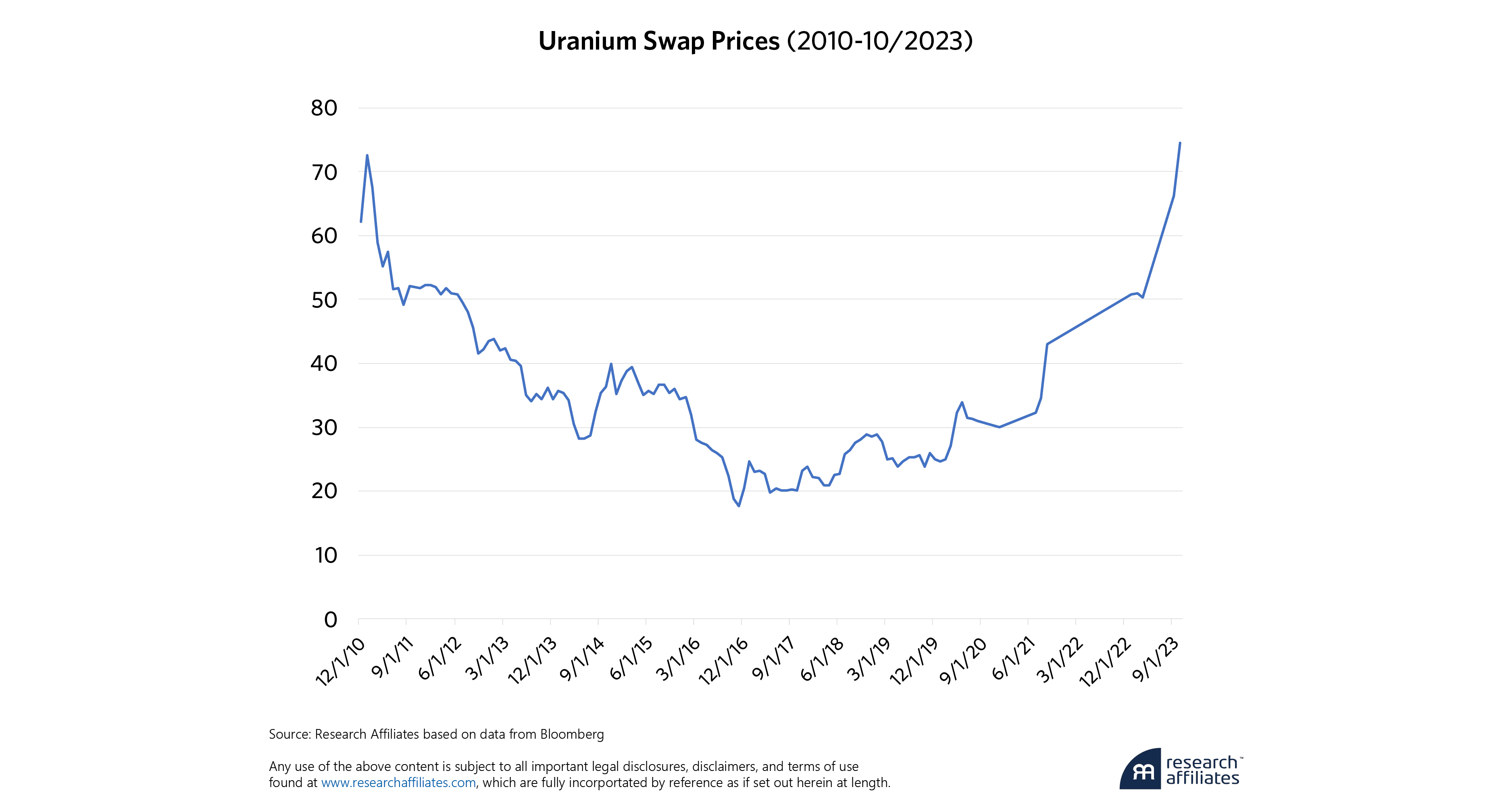 A second distinction is inflation. After cooling from nearly double-digit year-over-year levels in mid-2022, U.S. consumer and producer prices are increasing again. Commodity prices have been a key driver of the recent uptick in inflation and are expected to remain elevated in the medium to long term due to rising demand for both fossil fuel and renewable energy. Capital spending on oil & natural gas exploration has fallen for the last several years as producers have been forced to cope with the risks of the green “evolution” and the impact on strategic planning. Yet the global economy has not yet reached peak oil demand, meaning production must be maintained at current levels or even increased. The International Energy Agency (IEA) estimates global oil demand will increase to 105.7 million barrels per day (mb/d) by 2028, from 99.8 mb/d in 20224. Many renewable energy sources, such as nuclear and battery storage, are also commodity-dependent, creating long-term demand for the mining of materials ranging from copper to uranium and rare earth metals. Uranium prices, for example, after a decade of largesse have rebounded sharply as demand expectations have risen5. As a result, commodity inputs will be a stubborn headwind to managing inflation.