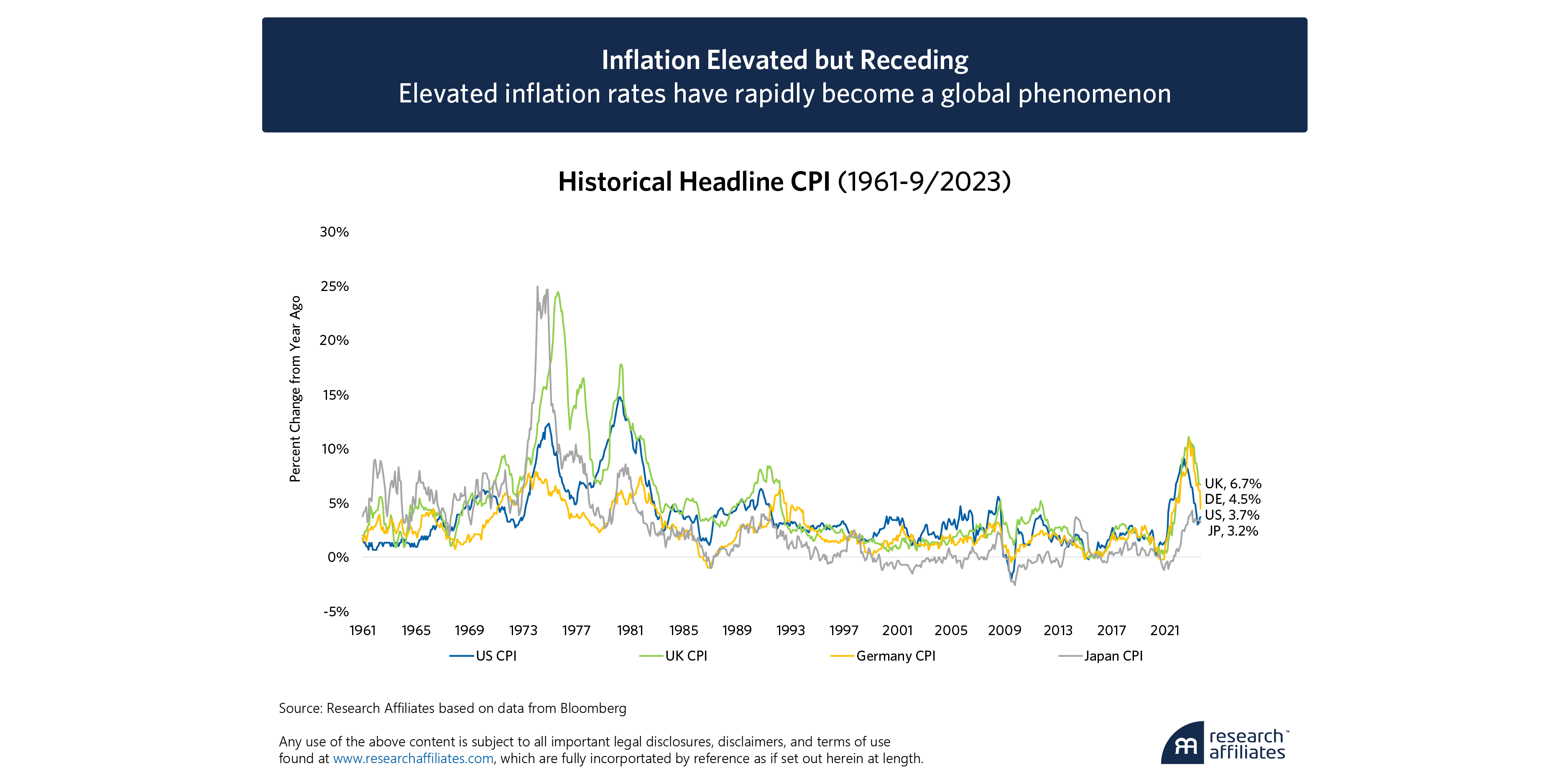 Inflationary and related pressures are even worse outside the U.S. In the United Kingdom, inflation spiked above 10% last year and remains several points higher than the U.S. Australia and Germany are also struggling to bring down price increases. Instead of the demand inflation it sought, the Bank of Japan is now dealing with the same price inflation as the rest of the developed world. With a weakening yen, rising yields and dependence on energy imports, rising oil prices could lead to more complications for a recovering Japan such as reducing its foreign investments. As Mohamed El-Erian recently noted, “There is a risk here that a disorderly exit by the Japanese authorities destabilizes domestic balance sheets with large JGB holdings, forcing them to dispose of positions in foreign corporate and sovereign bonds."6
