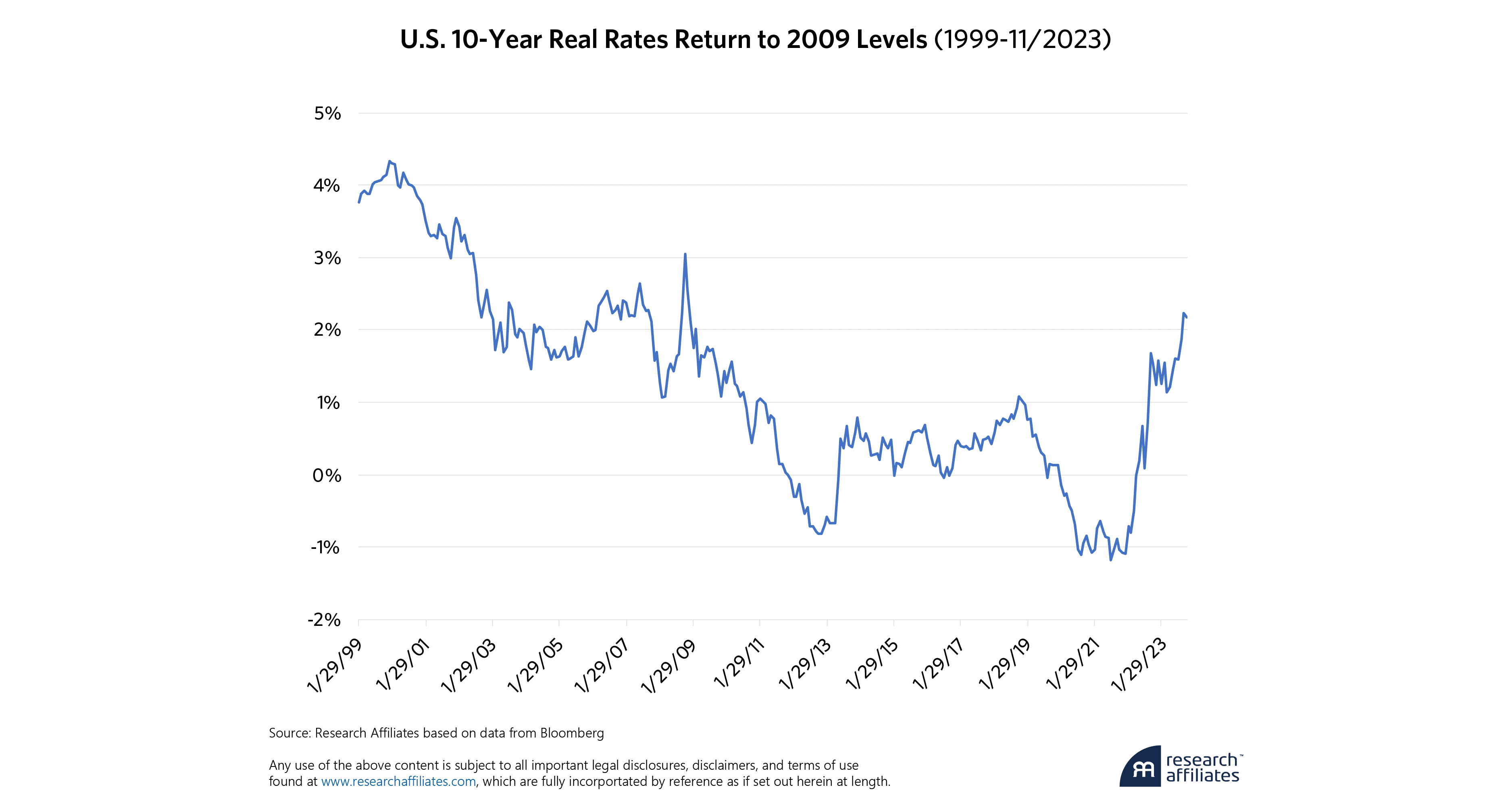 For those in retirement or on a fixed income, higher rates are a welcome relief from the paltry yields of the past decade. To understand the impact of rising rates, consider that from the end of 2021, through the end of October, cash has returned about the same as the S&P 500 Index. We expect real interest rates to stay positive over the next decade, making bonds a compelling asset.