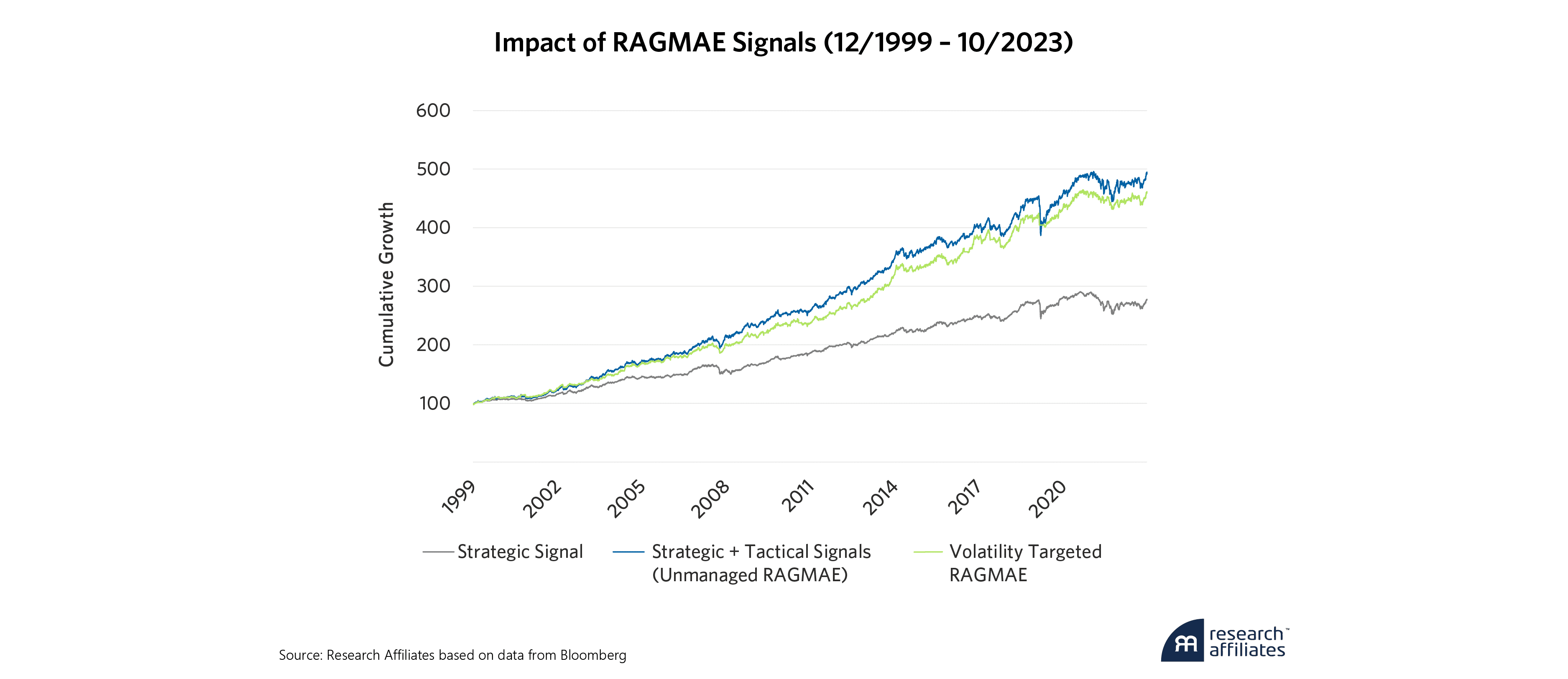 With this simple single asset example as a backdrop, let’s turn our attention to applying volatility targeting on a multi-asset portfolio. For the purposes of this analysis, we will use the Research Affiliates Global Multi-Asset Index (RAGMAE)5. The Research Affiliates Global Multi-Asset Index is a 5% volatility targeted multi-asset index combining futures exposure to 226 global equity markets, global government bonds and commodities, incorporating native diversification into the portfolio. The assets are combined using a set of both strategic/secular and tactical signals and wrapped in a custom volatility targeting framework. The base strategic portfolio utilizes Research Affiliates capital market expectations to ground the positions in forward looking expectations based on where assets are priced to go, not where they’ve been in the past7. On top of the strategic allocations are tactical over- and underweights based on the carry, value and trend momentum of the various assets. Utilizing these robust signals allows the index to capture shorter-term pricing opportunities that surround the secular trajectory of asset markets.