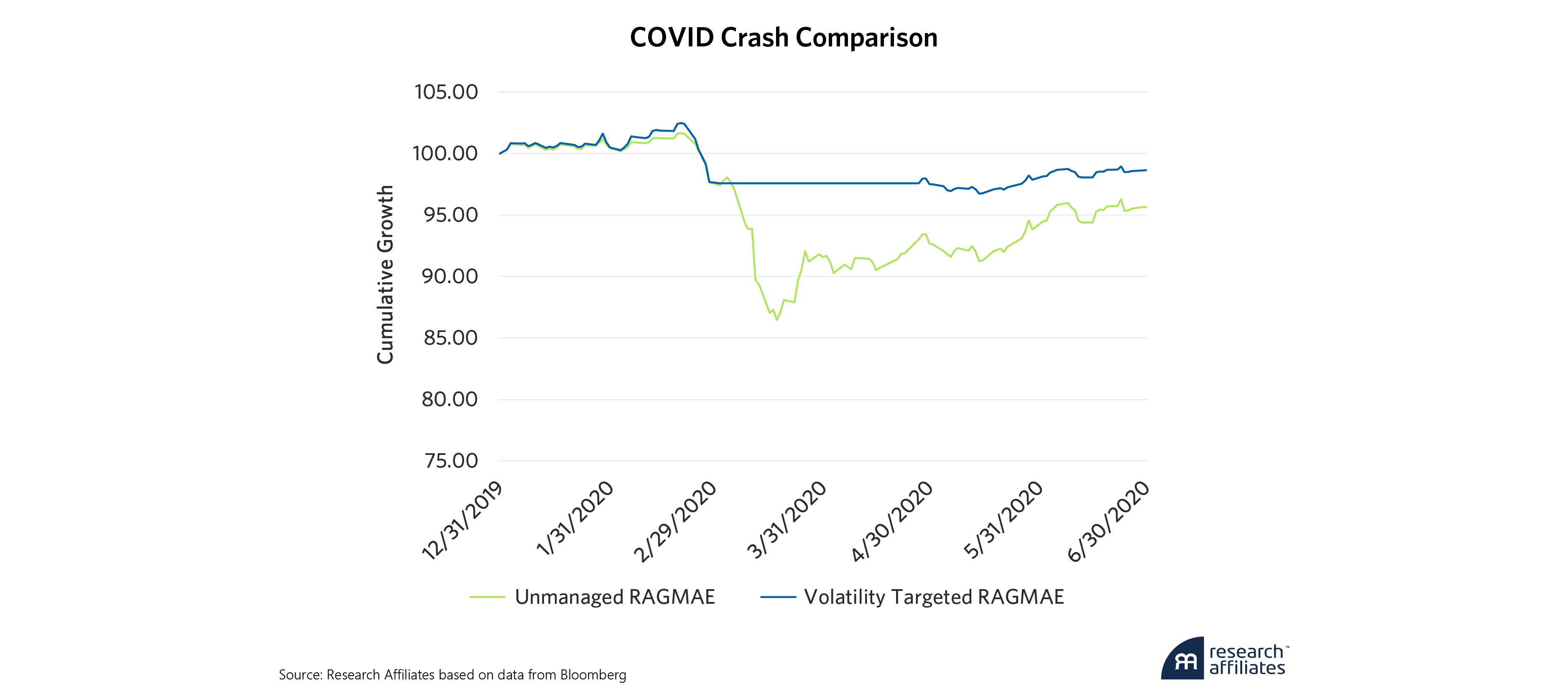 The RAGMAE index is designed to go beyond standard volatility targeting during crisis periods by over de-levering when volatility rises dramatically, while taking into account expected reductions in liquidity during these periods. Comparing the unmanaged portfolio to the volatility targeting portfolio during the COVID crash highlights this benefit. During the period of extreme market volatility in March of 2020, the RAGMAE index switched to cash. While the market subsequently quickly rebounded, the volatility managed portfolio still outperformed from March through June by 3.0%.