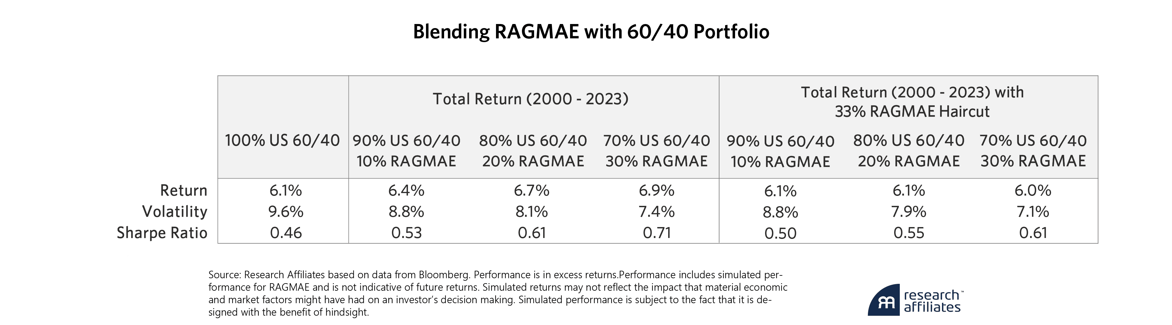 Acknowledging that much of the RAGMAE history is from a simulation, and tempering expectations of the future, even two thirds of the previous performance would be beneficial to the overall risk-adjusted performance of a 60/40 portfolio. Even after haircutting the historical simulation by a third, adding just 10% of RAGMAE to your 60/40 allocation increases Sharpe ratio by 10%.