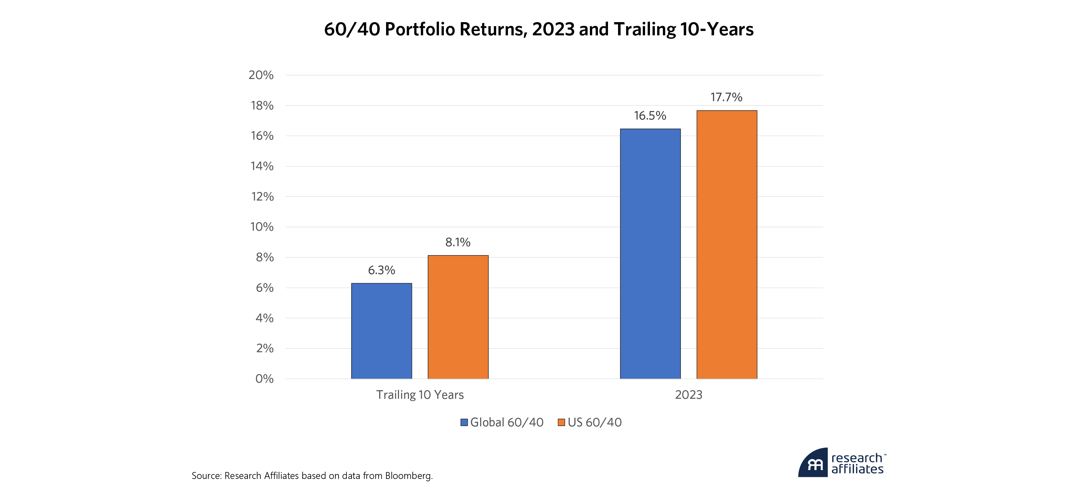 As the calendar closed on 2023, investors were once again treated to magnificent returns in their stock and bond portfolio. Global stocks as represented by the MSCI All Country World Index (ACWI) returned 22.8% while global bonds (Bloomberg Global Aggregate Index) also ended the year in the black, with a return of 5.7%. Put those together, and a Global 60/40 portfolio provided strong 16.5% returns in 2023 to cap off a 6.3% annualized return over the last decade. Investors focused exclusively on the U.S. corollary of the 60/40 portfolio did even better, returning 17.7% in 2023 and 8.1% annualized over the trailing decade.