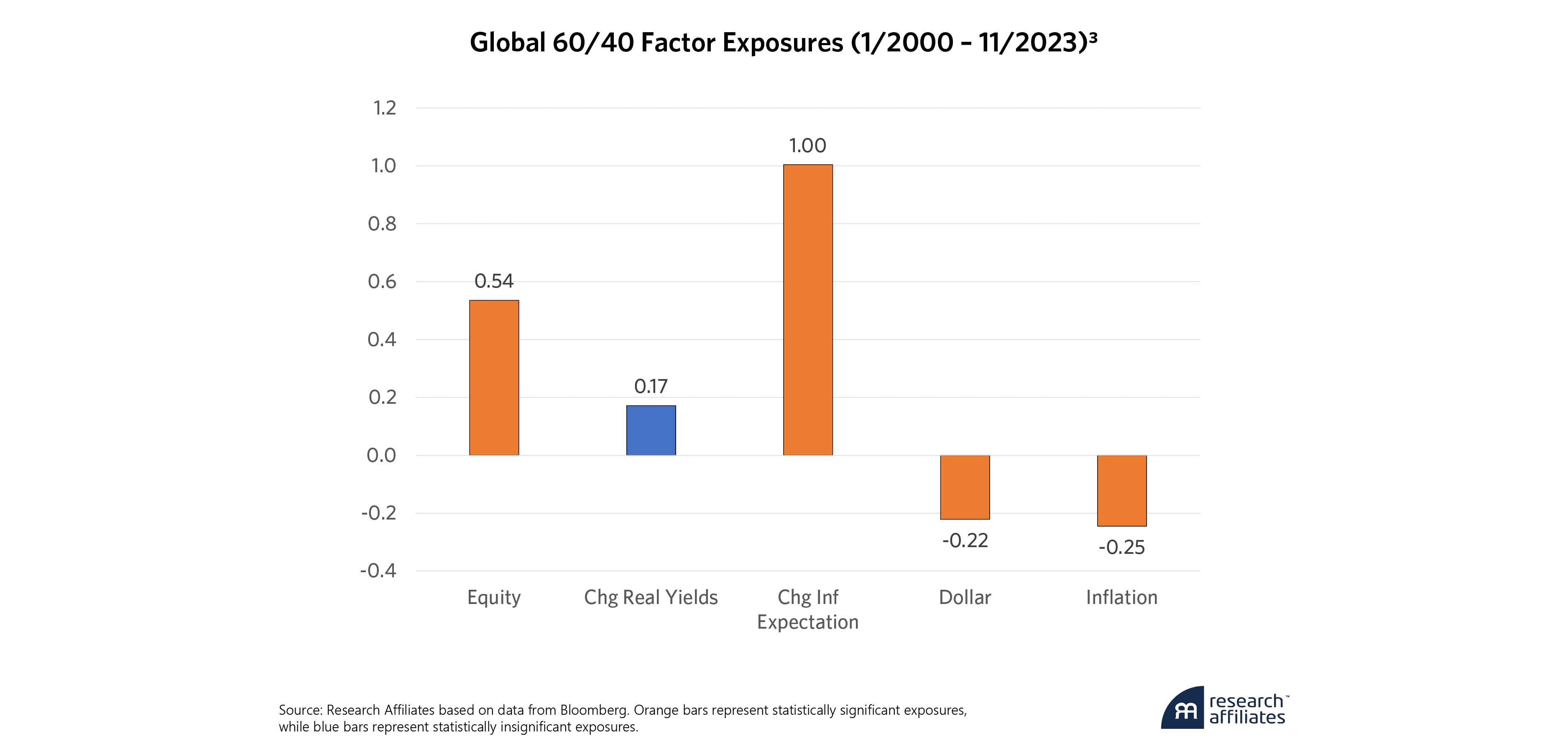 The portfolio has a duration close to 1 to changes in inflation expectations as defined by break-even inflation (BEI), meaning the return of the portfolio increases by 1% for every 1% increase in BEI. However, the portfolio also has negative exposures to both the dollar and realized changes in month-over-month inflation. Said differently, the Global 60/40 portfolio suffers when the dollar strengthens and when monthly CPI changes are positive, losing about 25% of the change in either variable.