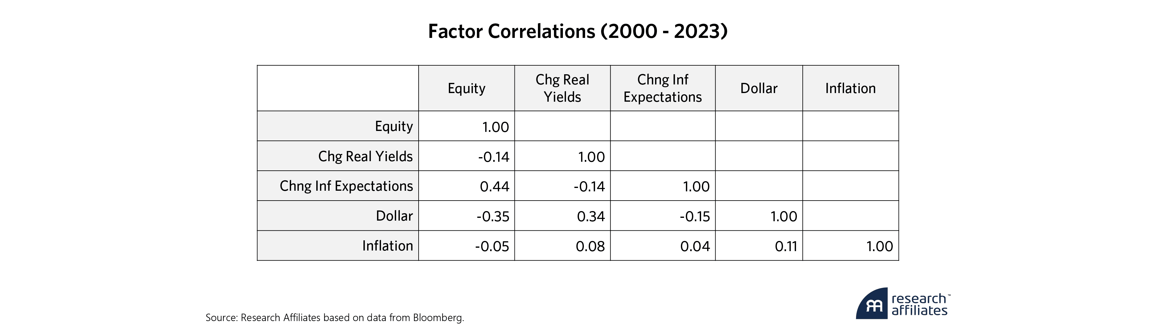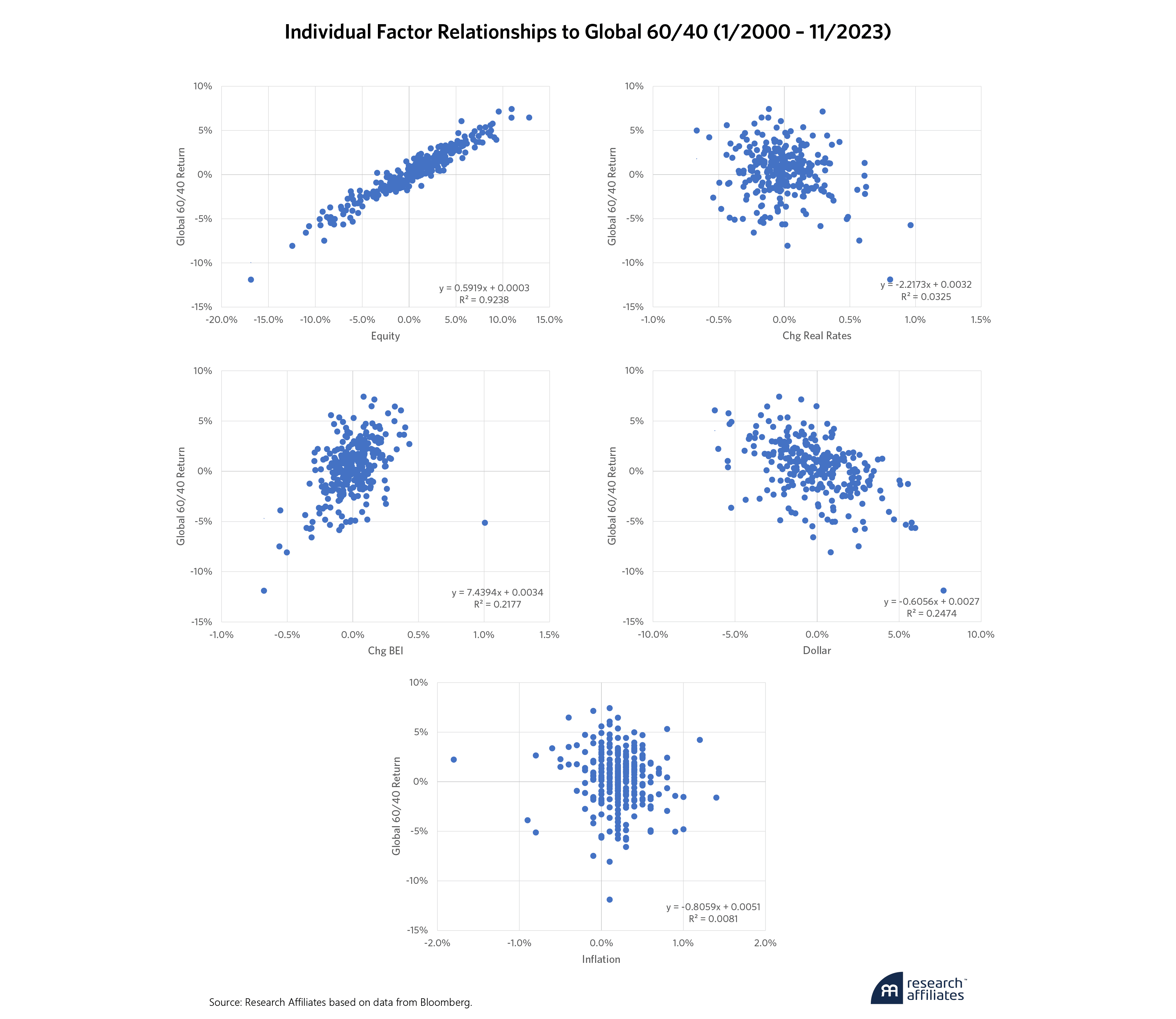 These particular factors were chosen as they capture major macro variables that impact asset returns. For example, equity exposure forms the backbone of most investor portfolios as investors desire to take part in the growth of the economy. Changes in bond yields and inflation expectations, when taken together, combine to form changes in nominal interest rates which drive changes in the bond returns of the core 60/40 portfolio. By breaking them apart we can independently understand the impact of each. For investors with some global exposure, which is most investors, portfolio returns are impacted by changes in currency rates. Finally, while in the long term, relative differences in inflation affect currency prices, in the short term there can be a divergence and it’s beneficial to capture the impact of realized inflation separately. This is especially top of mind relative to the last few years where purchasing power was eroded due to higher-than-average inflation and investors expected their portfolios to cover the difference.