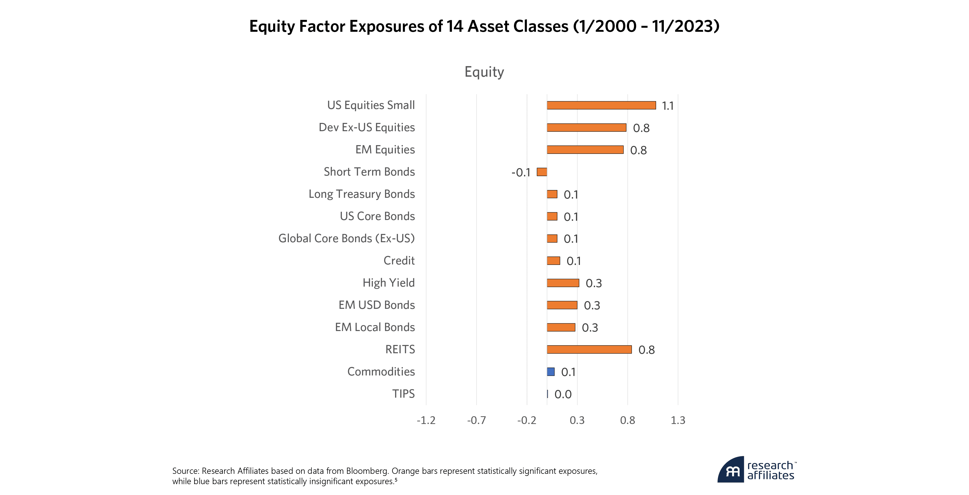With the exception of short-term bonds, commodities and TIPS, all assets have a statistically significant positive exposure to equity risk. Short-term bonds tend to do well during equity selloffs as they become an asset of choice during risk-off events. However, as we’ve seen, a bond allocation much greater than 40% is needed to diversify equity risk.