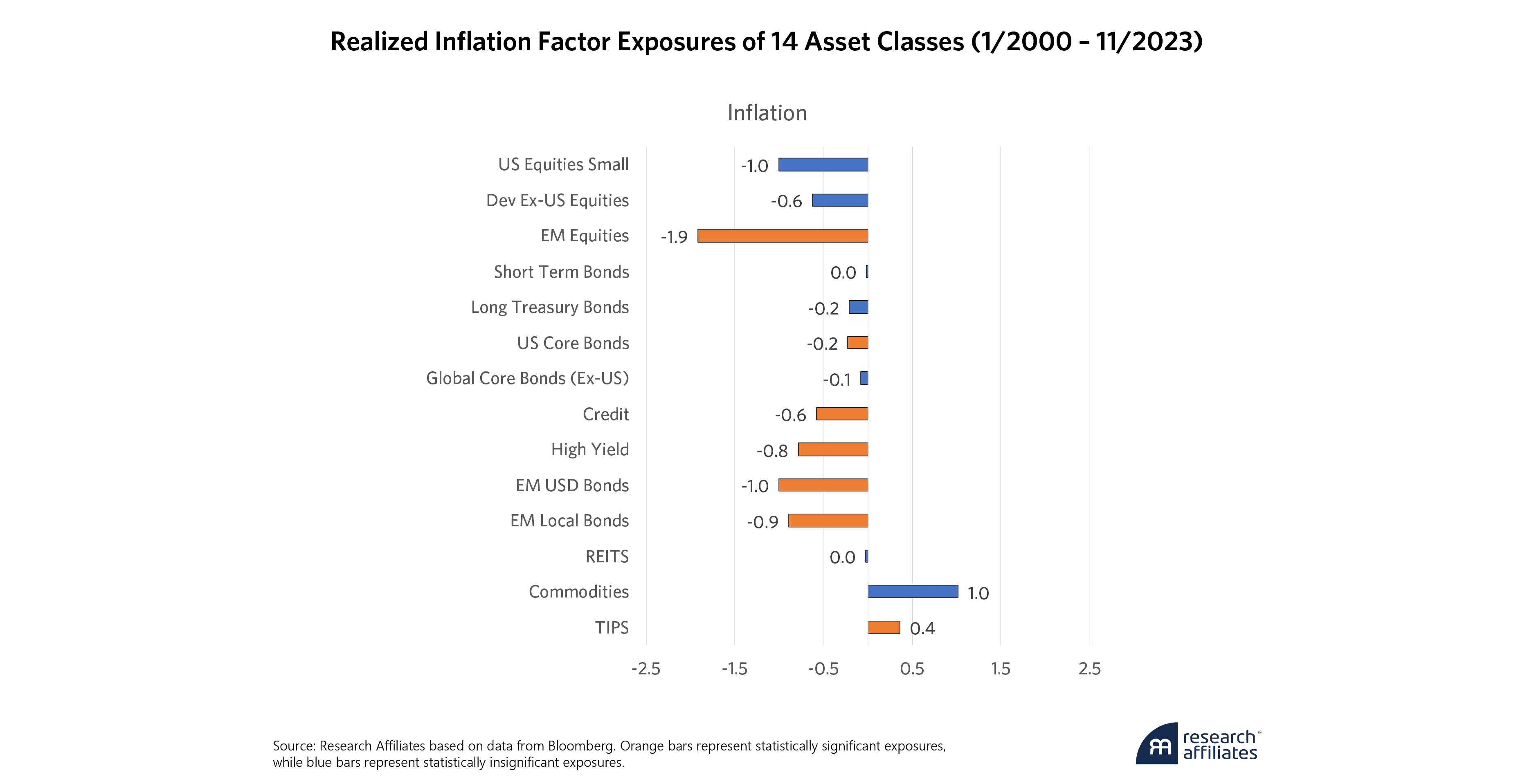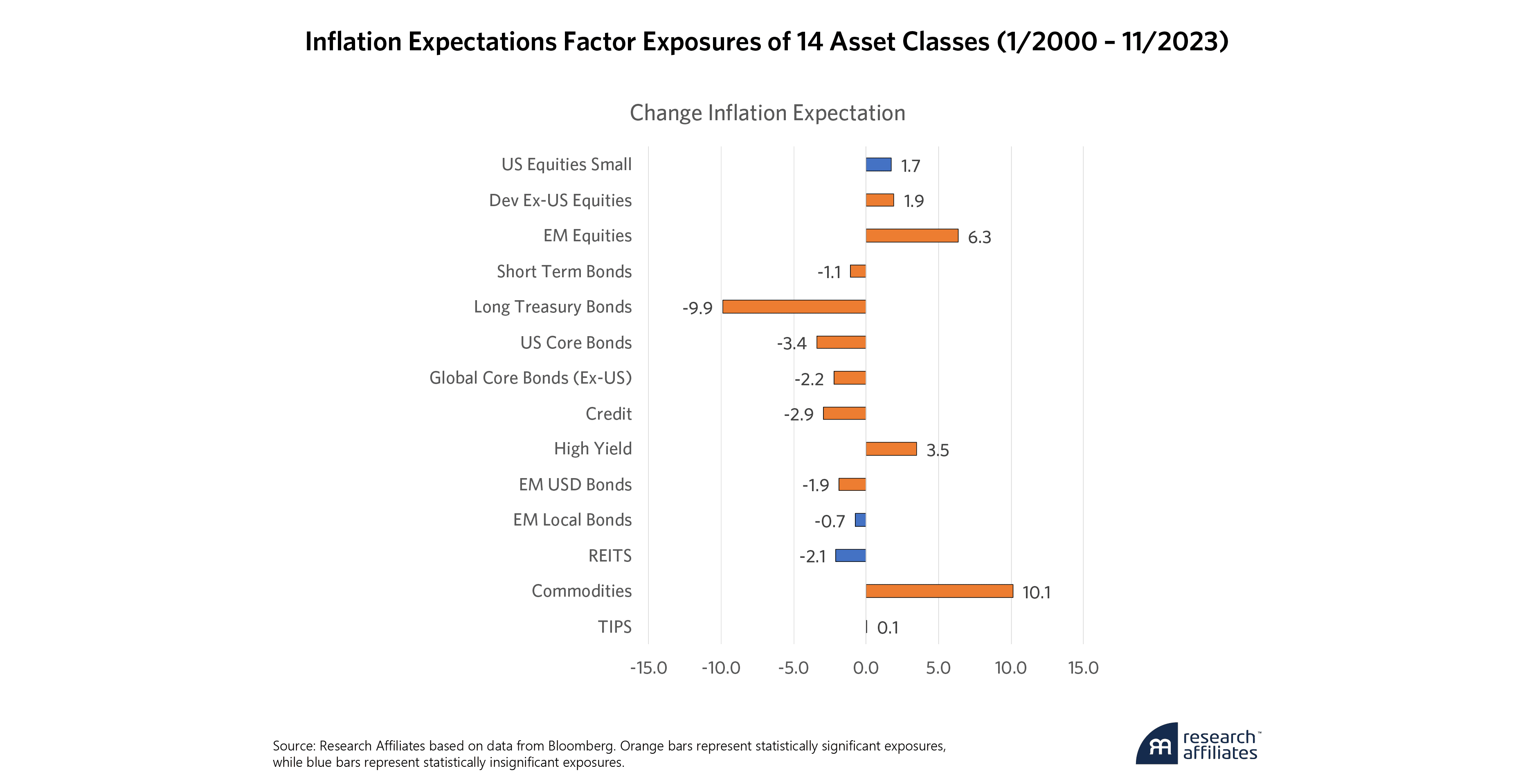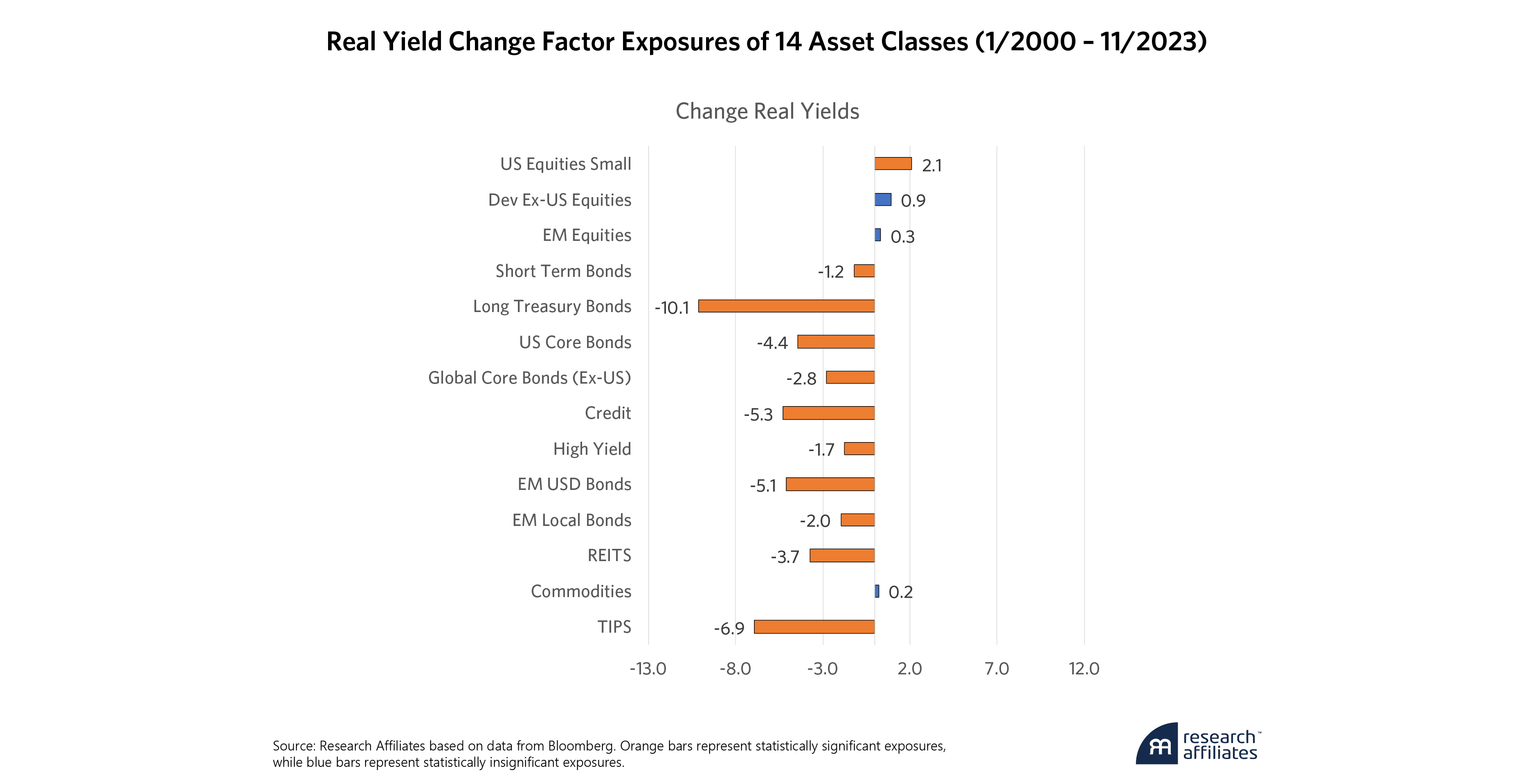 With respect to the change in real yields, these exposures correspond closely to the duration of each asset class, with some limited impact from the other factors. Here again, most of the exposures are statistically significant and negative, as increases in yields correspond to lower prices. REITS also have a negative exposure due to increases in funding costs of leverage from rising rates. The positive exposure of small cap equities is a bit surprising as smaller companies tend to be more negatively sensitive to changes in rates. In this case, although the exposure is significant, its significance is quite low relative to most of the other asset classes and may simply be statistically spurious.