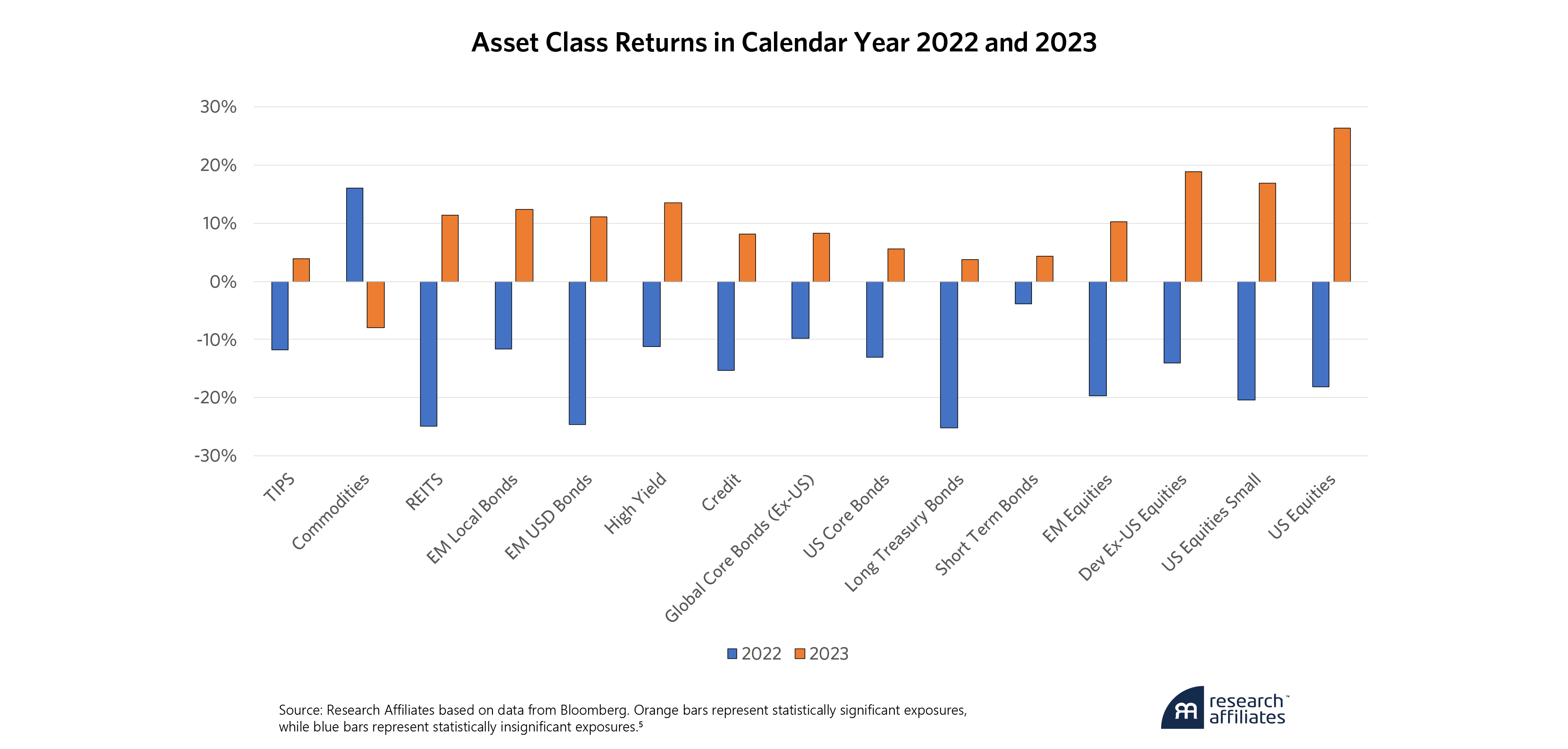 Representative indices for these asset classes include S&P 500 for US Equities, Russell 2000 for US Equities Small, MSCI EAFE for Dev Ex-US Equities, MSCI EM for EM Equities, Bloomberg 1-3 Year Treasury for Short Term Bonds, Bloomberg Treasury Long for Long Treasury Bonds, Bloomberg US Aggregate for US Core Bonds, Bloomberg Global Agg Ex-USD for Global Core Bonds, Bloomberg US Credit for Credit, Bloomberg US Corporate High Yield for High Yield, JP Morgan EMBI+ for EM USD Bonds, JP Morgan GBI-EM Global Diversified for EM Local Bonds, FTSE NAREIT All Equity for REITS, Bloomberg Commodity for Commodities and Bloomberg US TIPS for TIPS.