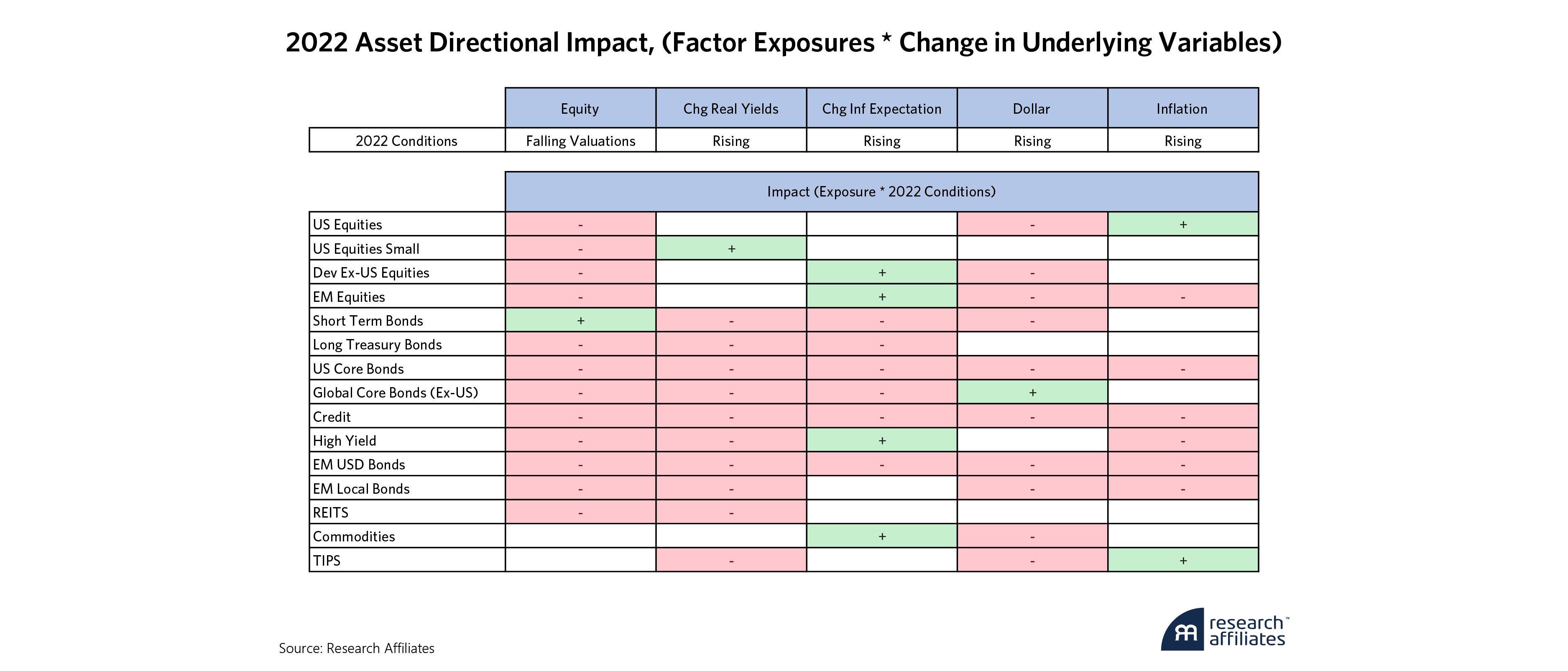 By multiplying our asset exposures to each factor by the conditions occurring in 2022, we see a lot of red, negative impacts, and few green positive tailwinds from this combination of storm clouds. This was a hard slider that started in the strike zone, but did a nasty turn, ending up off the plate.