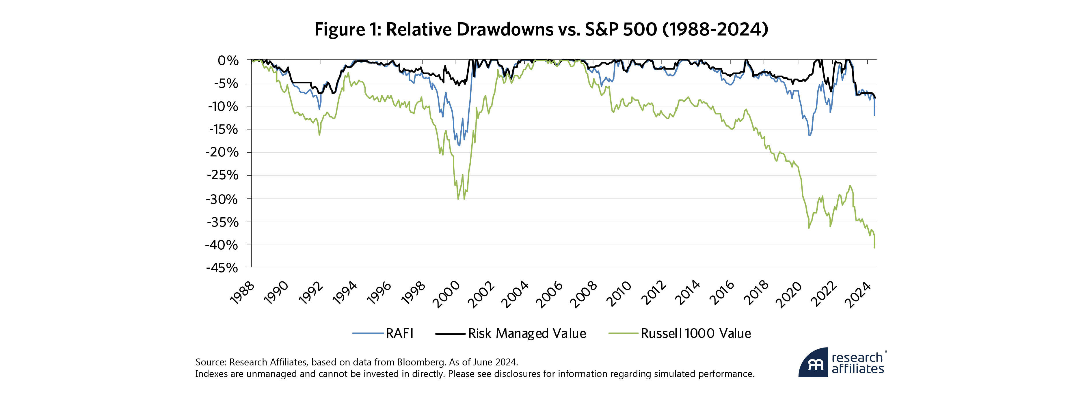 To examine the efficacy of RADTEC in managing the downside risk, Figure 1 shows the relative drawdowns (drawdown in relative wealth, i.e., peak-to-trough decline of a portfolio relative to a benchmark) of RAFI, RMV, and Russell 1000 Value relative to the S&P 500. The downside risk mitigation provided by RMV produces material improvements in relative drawdowns as measured in terms of magnitude and speed of recovery.
