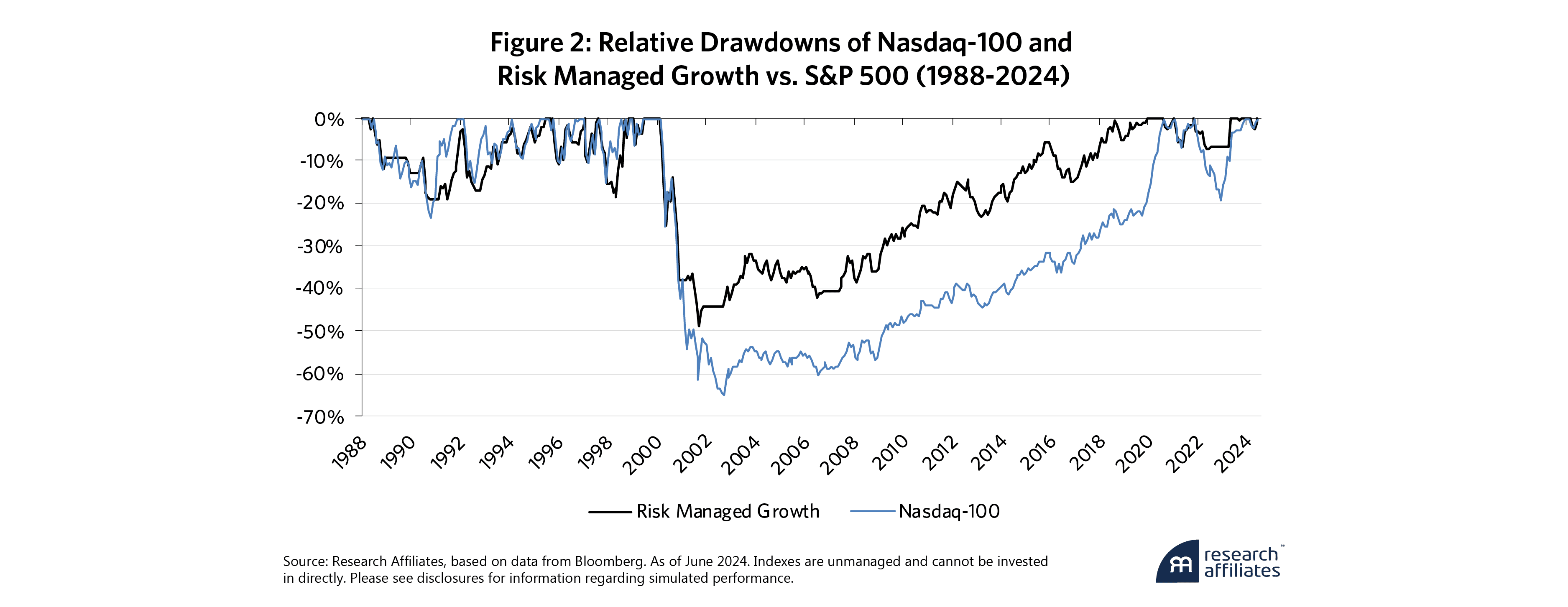 The effectiveness of RMG's risk management is further illustrated by its drawdown profile shown in Figure 2. While the Nasdaq-100 experienced a substantial relative drawdown during the dot-com bubble collapse and the 2022 inflationary bear market, RMG's drawdown profile was considerably improved in magnitude and speed of recovery. Although RADTEC does not eliminate the considerable risk in the highly volatile Nasdaq-100, this example demonstrates the ability of RADTEC to capture the upside performance while mitigating downside risk. This delivers a smoother investment experience for technology-oriented investors, potentially leading to improved long-term outcomes.