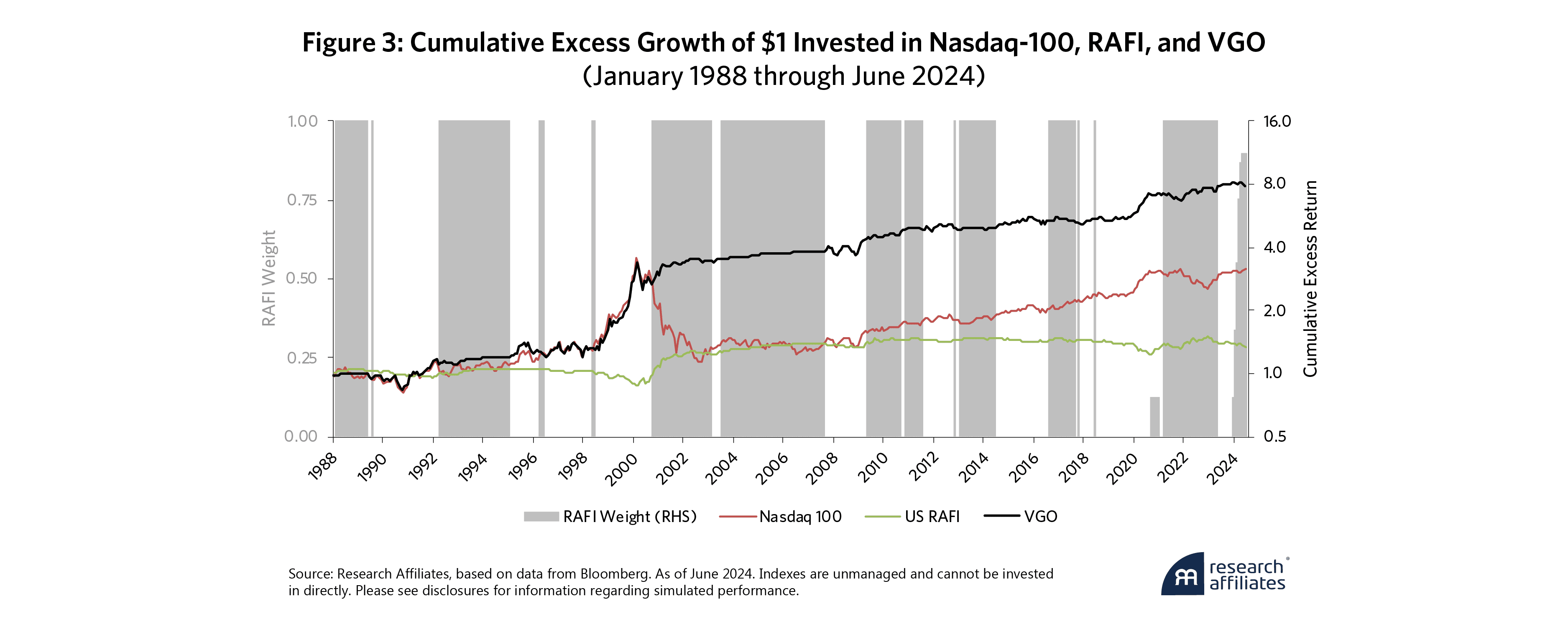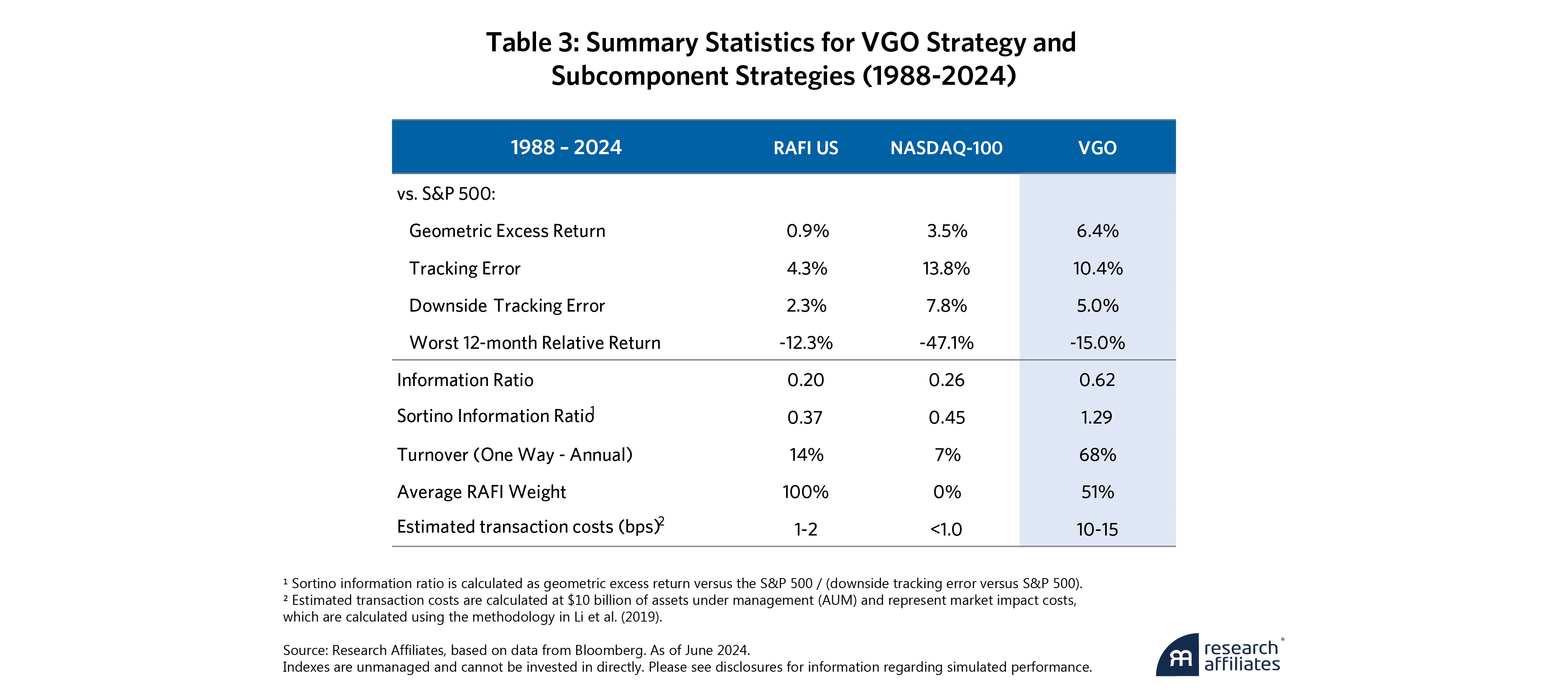 Table 3 shows that the simulated VGO strategy outperforms both RAFI and the Nasdaq-100 individually, achieving a higher average excess return than the average of the two. This outperformance is accompanied by a maximum drawdown that is significantly smaller than that of the Nasdaq-100 and comparable to that of RAFI. VGO's Sortino information ratio is more than double that of both RAFI and the Nasdaq-100, indicating superior risk-adjusted performance that is achieved through the dynamic timing of allocating to value and growth.