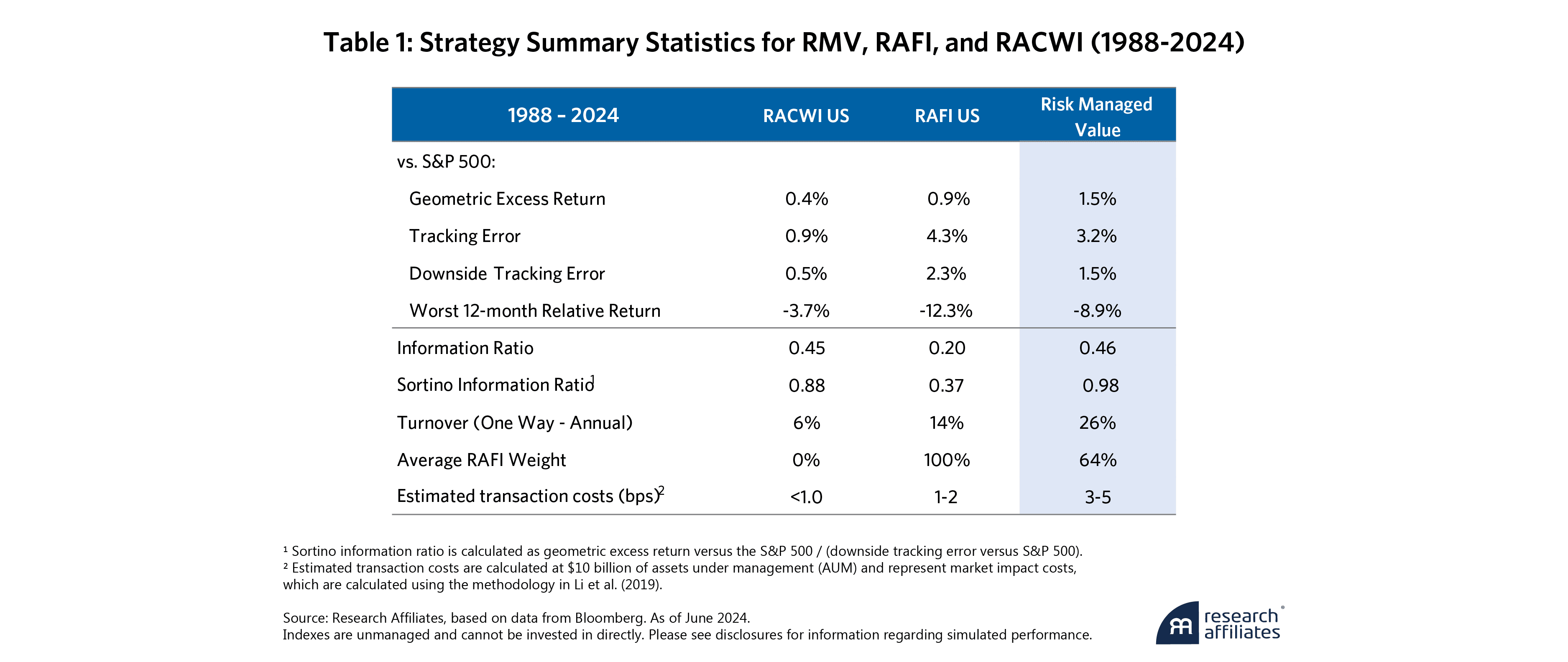The Risk Managed Value (RMV) strategy blends the Research Affiliates Fundamental Index (RAFI), a value strategy, with the Research Affiliates Cap-Weighted Index (RACWI), a cap-weighted proxy for the S&P 500 with the same constituents as RAFI. The use of RACWI as the benchmark portfolio allows for reduced turnover and improved implementation efficiency compared with using the S&P 500 directly. The results are similar if the S&P 500 is used.