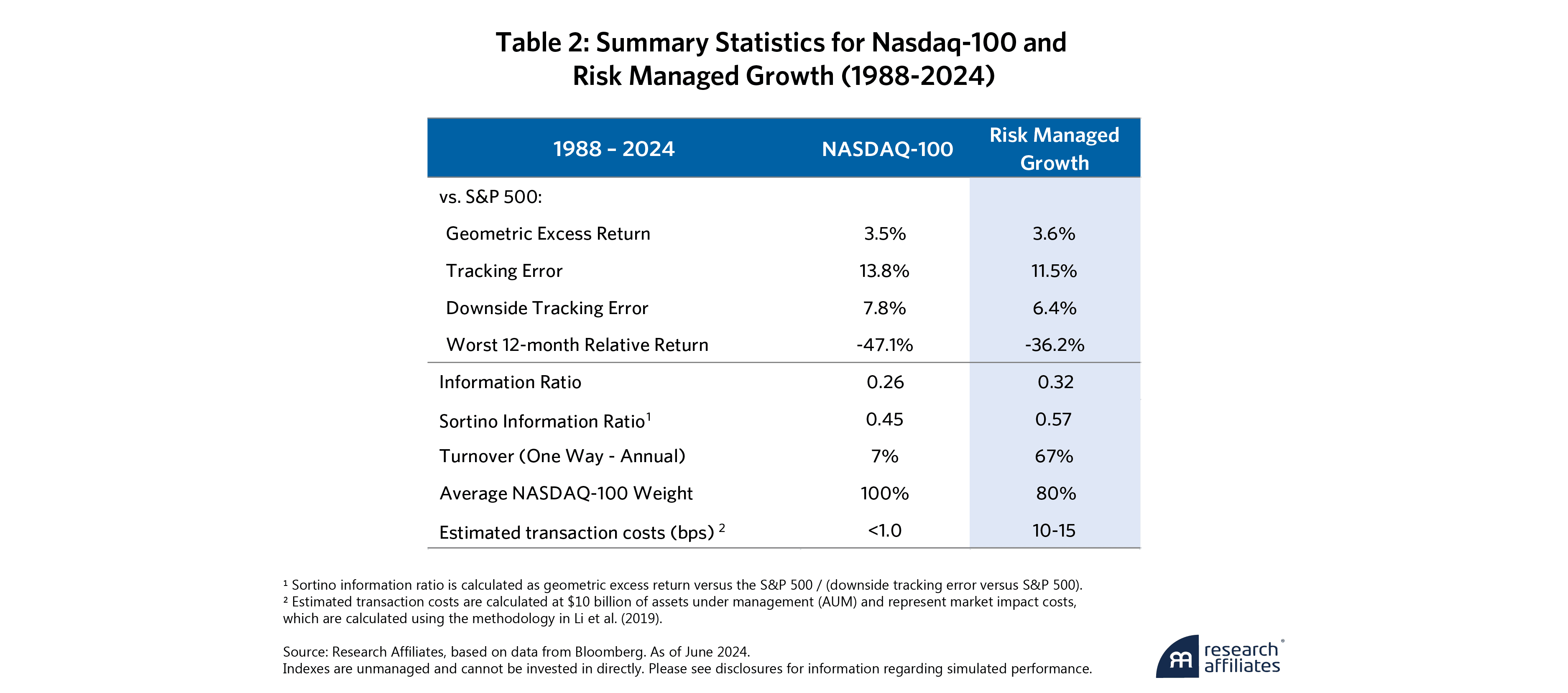 Table 2 shows the simulated performance of RMG, which outperforms the Nasdaq-100 on a risk-adjusted basis, as evidenced by a higher Sortino information ratio. This improvement is achieved while also reducing tracking error and significantly mitigating the maximum drawdown compared with the Nasdaq-100. The risk management framework effectively reduces active risk when tracking error exceeds the predetermined target, as observed during the dot-com bubble collapse and the 2022 inflationary bear market.