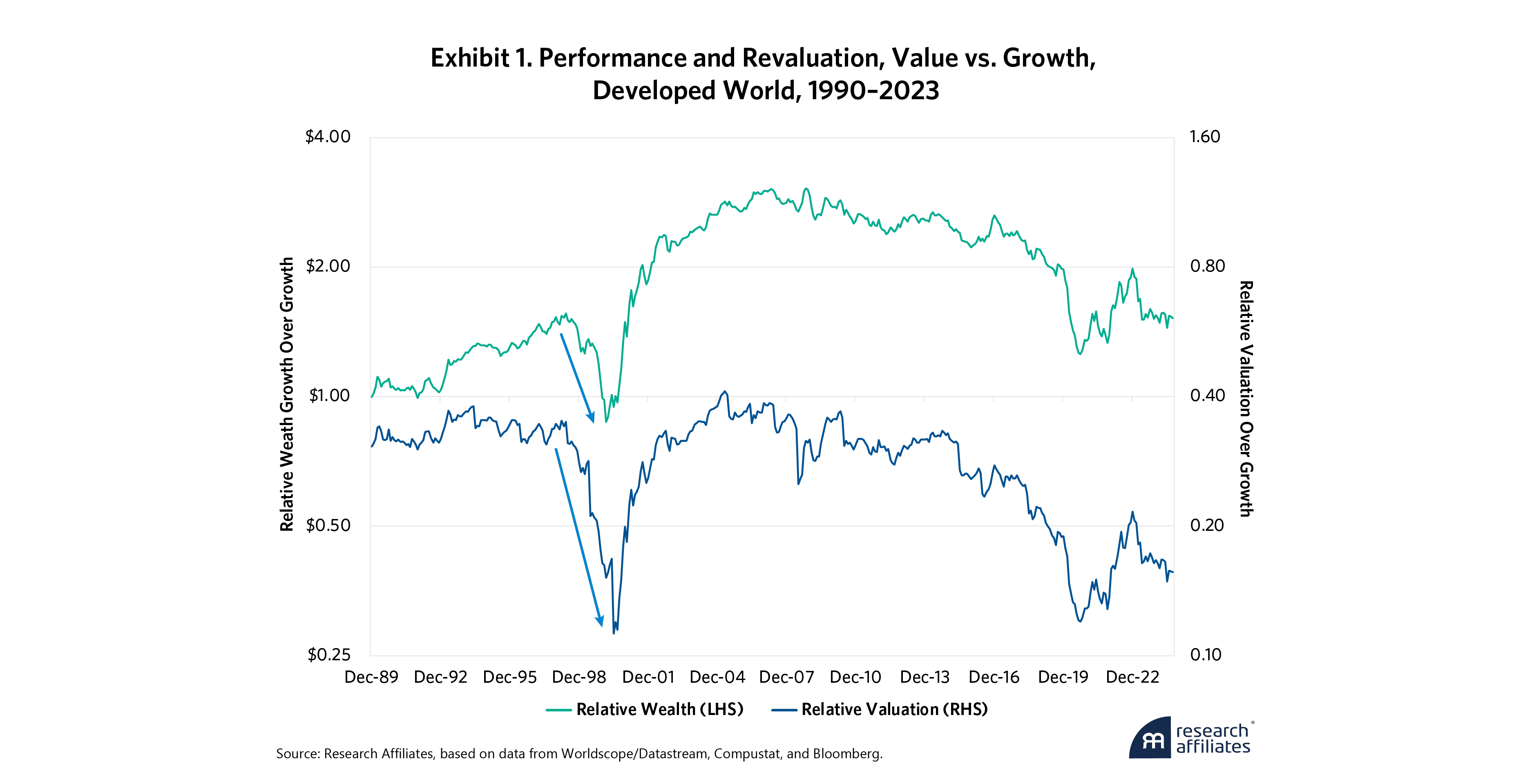 Revaluation alpha can be an enormous part of the historical returns that we observe. The blue arrow in Exhibit 1 shows that, from May 1998 to February 2000, the value investor’s wealth relative to the growth investor’s wealth plunged a horrific 44%, from 1.56 to 0.87. During that same span, the valuation of the value portfolio relative to the growth portfolio tumbled from 35% to 15%, an even larger 57% drop in relative valuation multiples. This 57% drop constitutes a “revaluation alpha” of –57%. If the portfolio relative performance was better than the revaluation alpha (–44% versus –57%), then the underlying fundamentals of the value portfolio—its sales, cash flow, book value, and dividends—were improving relative to the growth portfolio, albeit more because of rebalancing than organic growth.2