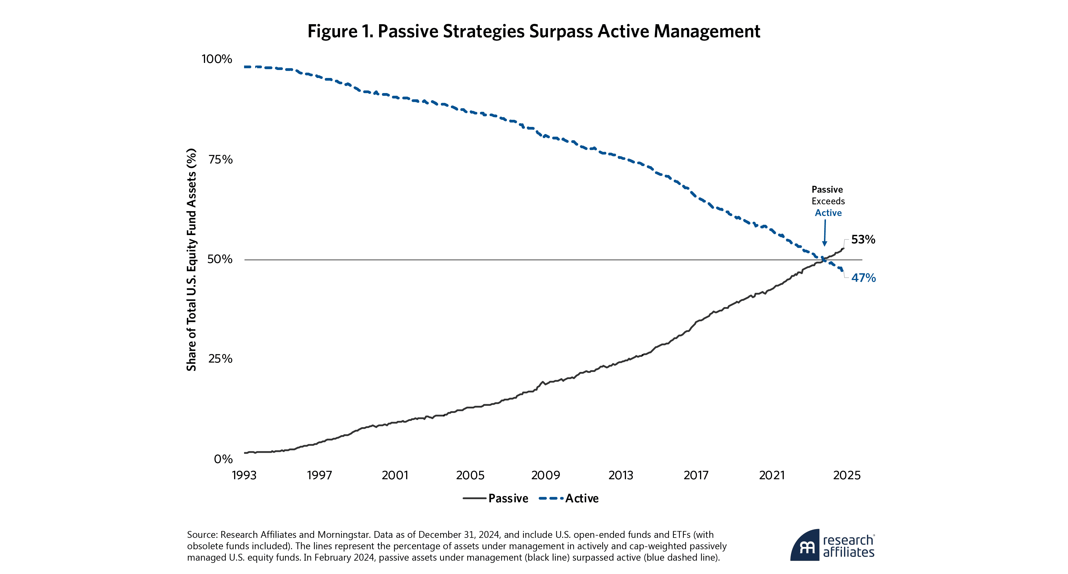 Two considerations have understandably driven investors to increasingly allocate to passive products: (1) the failure of active management to consistently outperform cap-weighted indices and (2) substantially lower fees for index funds.