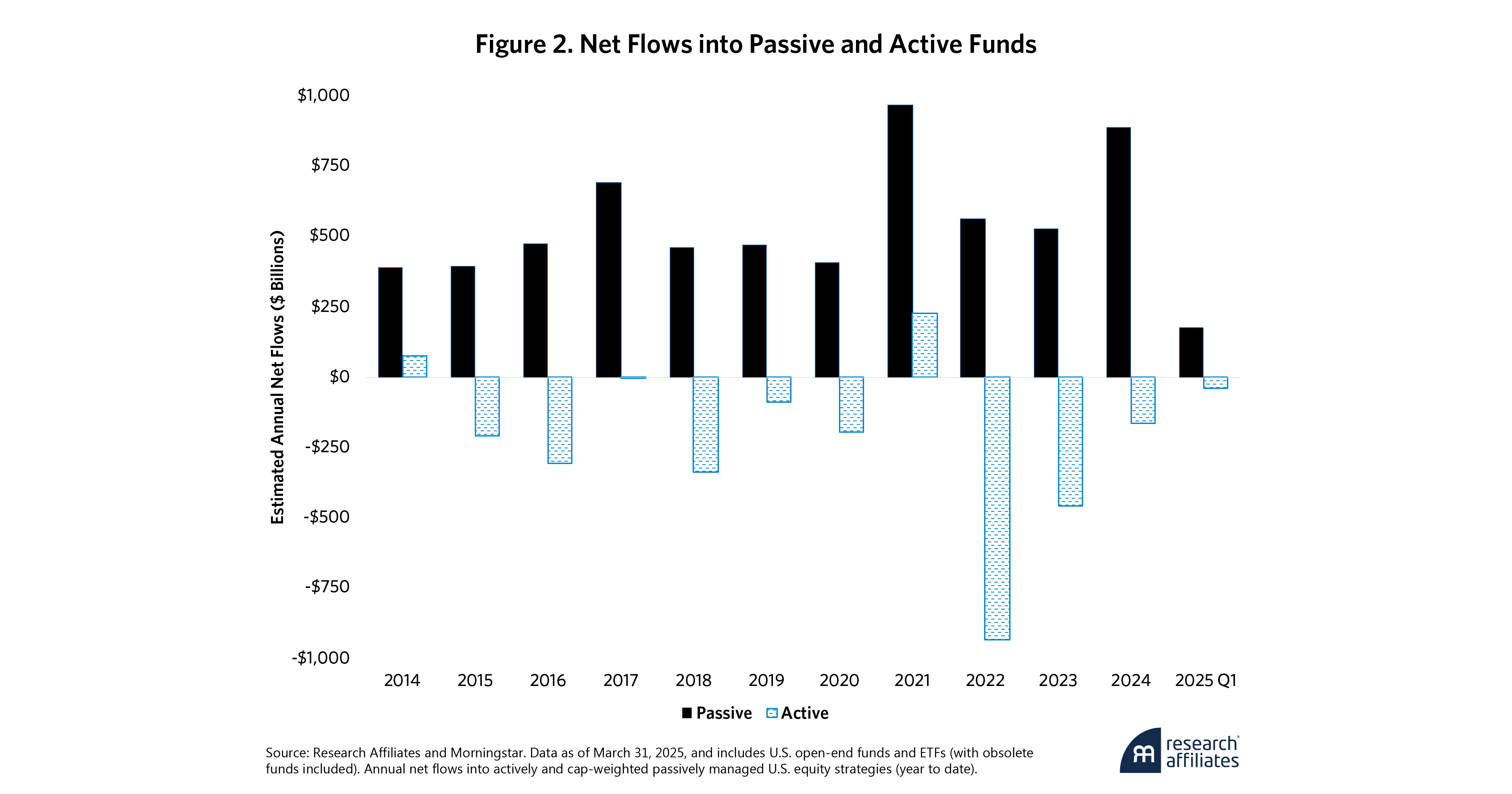Passive investing now dominates capital allocation, as is evident in Figure 1. Further, there is good reason to believe that the passive share is far higher because many institutional investors are “closet indexers.”2 Passive funds have absorbed consistent, large-scale inflows across market cycles while active funds have experienced persistent net redemptions, as shown in Figure 2. According to an ETF Global Insights report, global ETF net inflows reached nearly $2 trillion in 2024, and the Financial Times has reported that, globally, investors withdrew a record $450 billion from actively managed funds in 2024, surpassing the previous year's outflow of $413 billion. The scale and persistence of this divergence demonstrates the structural reallocation of investor capital toward passive index products.
