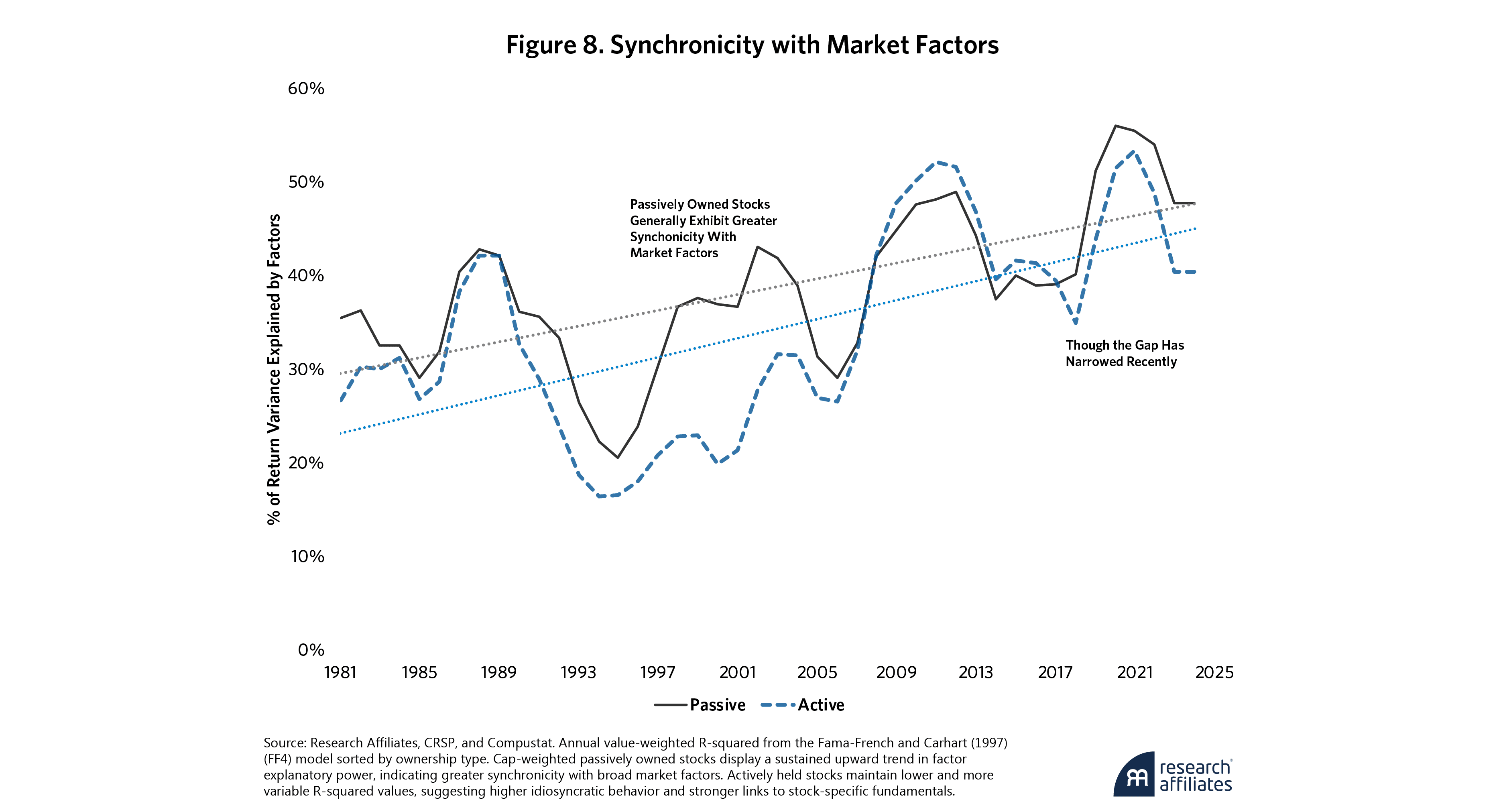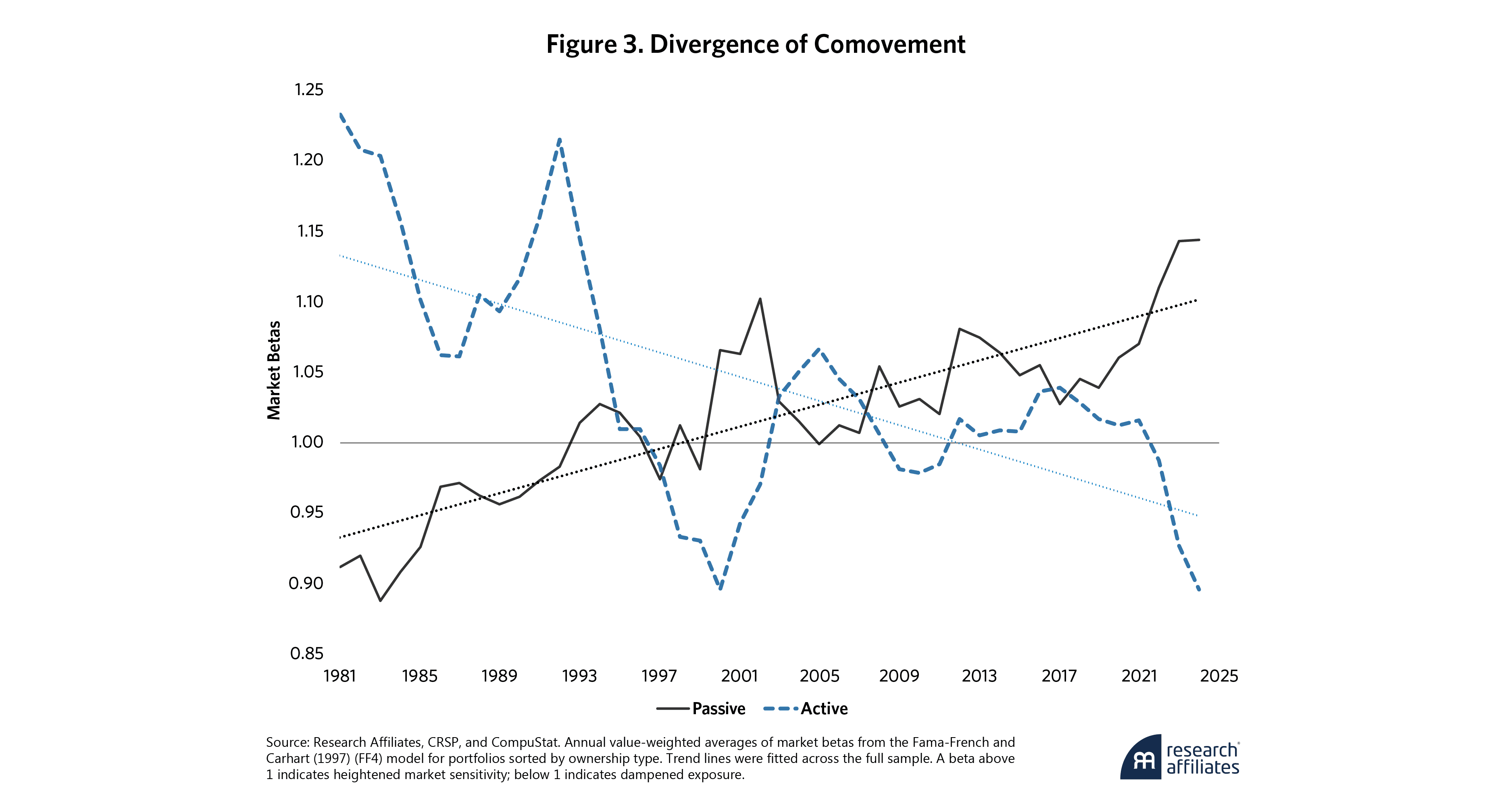 Stocks with different underlying business models and sectors are increasingly moving together, as shown in Figure 3. Stocks with high passive ownership display rising betas, whereas actively held stocks have shown a declining trend, a pattern that underscores a structural divergence in market responsiveness.