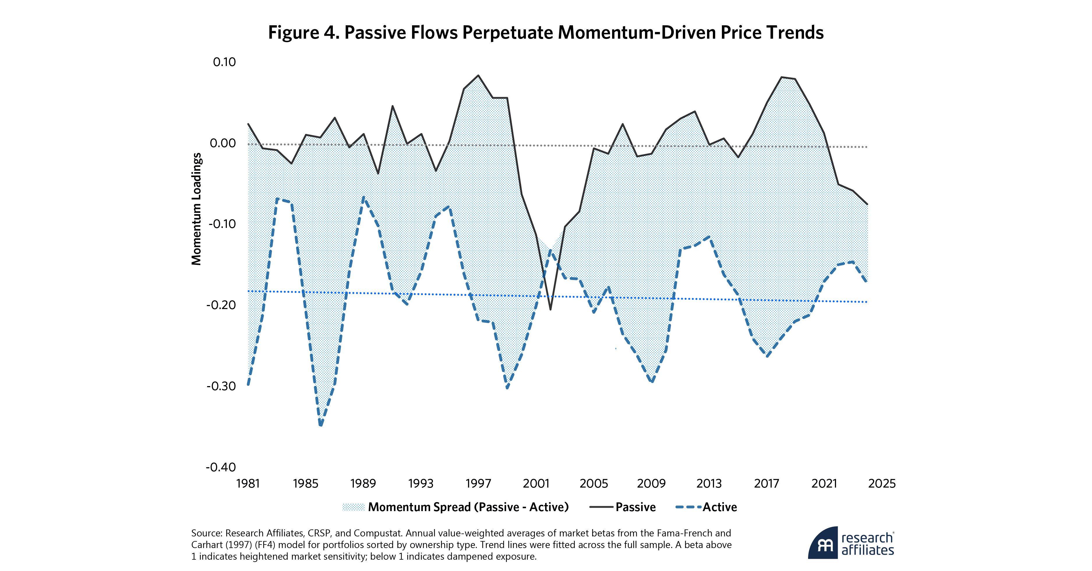 As shown in Figure 4, passively owned stocks exhibit near-zero or mildly positive momentum exposure but actively held stocks display consistently negative loadings, reflecting contrarian positioning. The spread highlights a self-reinforcing feedback loop: momentum-driven flows into passive vehicles elevate recent winners while active managers lean against price trends, sustaining the structural divergence of fund flows and investor allocations.