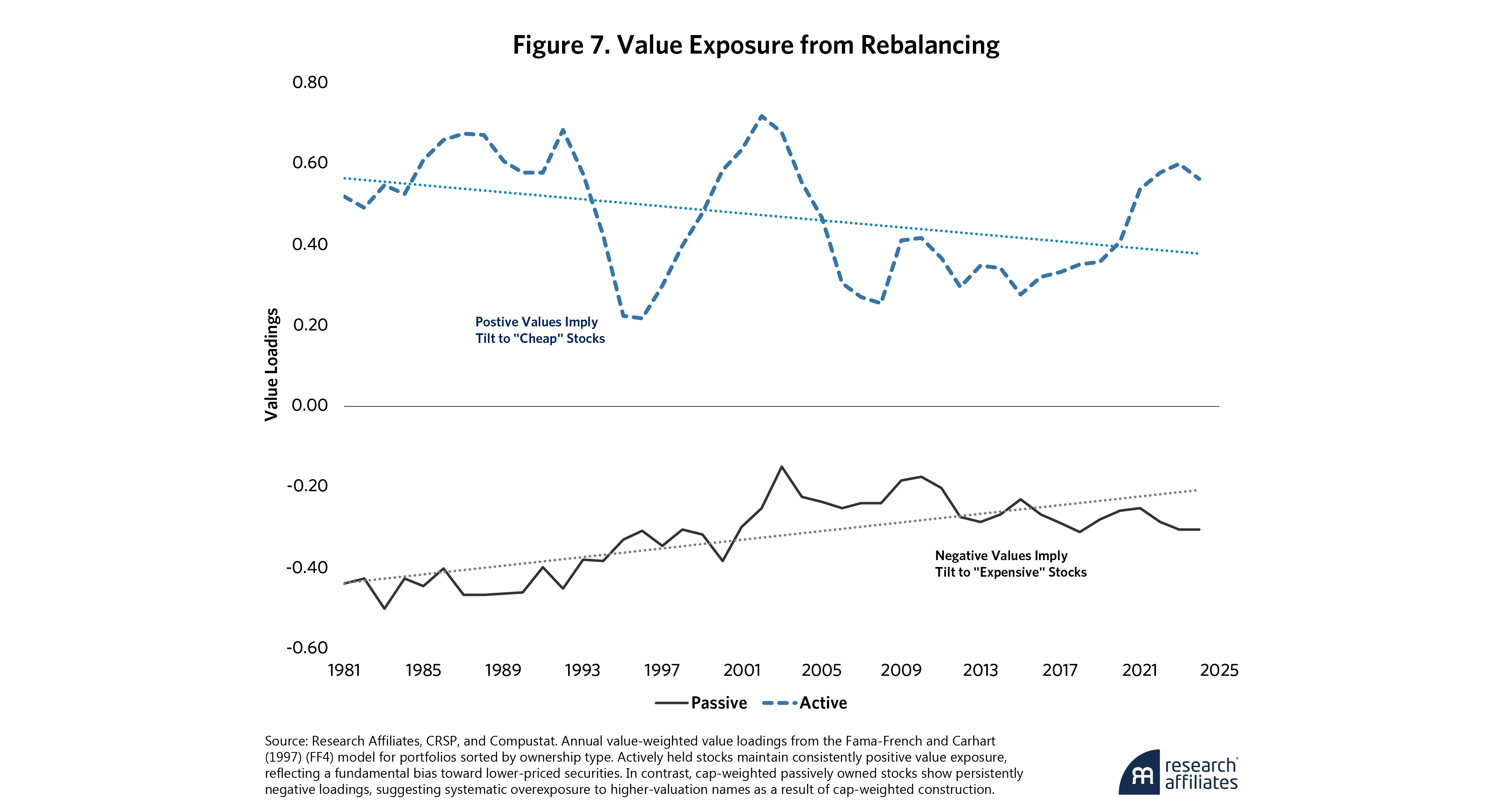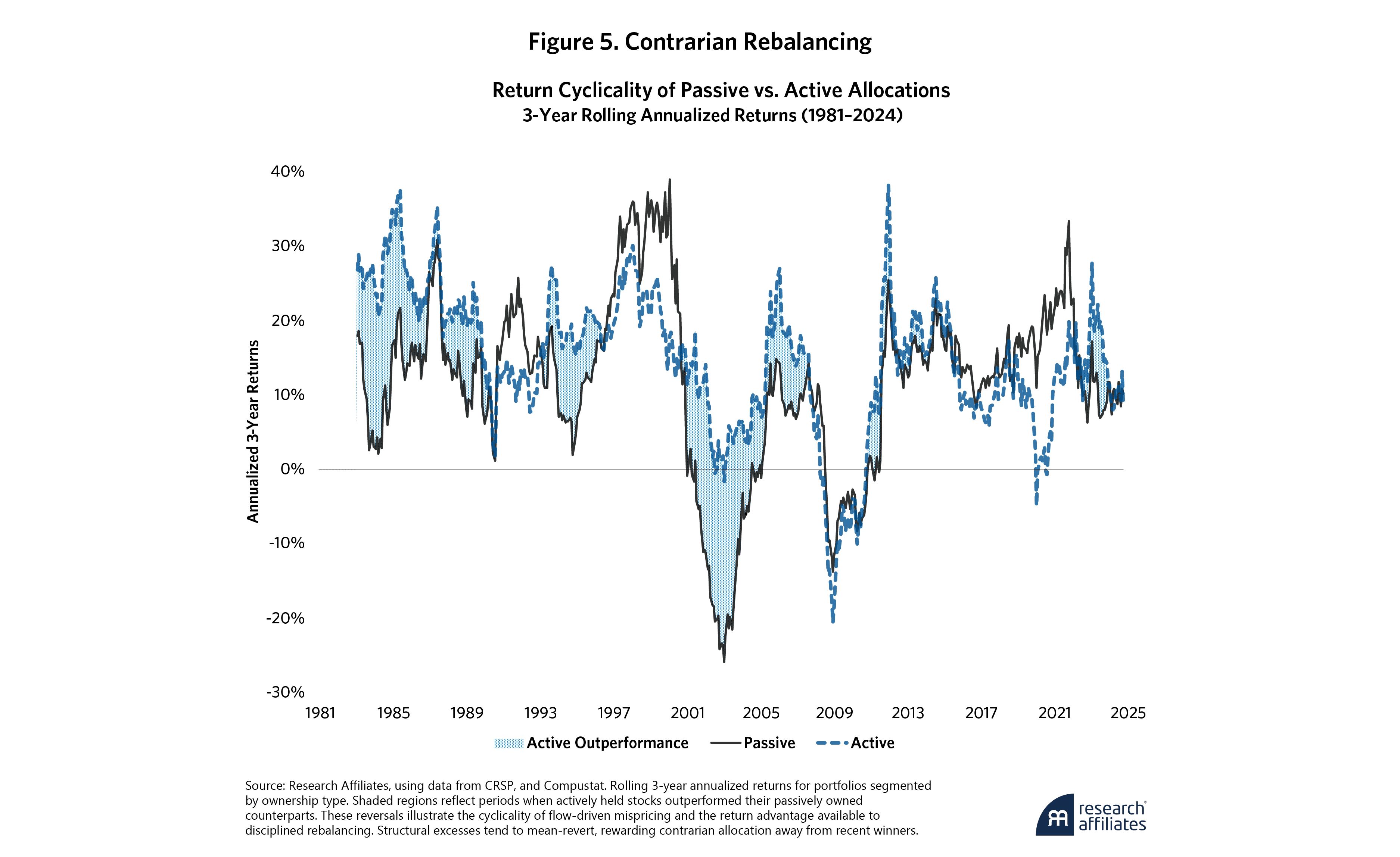 Mechanical flows distort prices, which may eventually revert toward fundamental values. Figure 5 shows how this dynamic has worked through time, with shaded regions indicating periods when actively held stocks outperformed their passively owned counterparts. These reversals illustrate the cyclicality of flow-driven mispricing and the return advantage available to disciplined rebalancing.