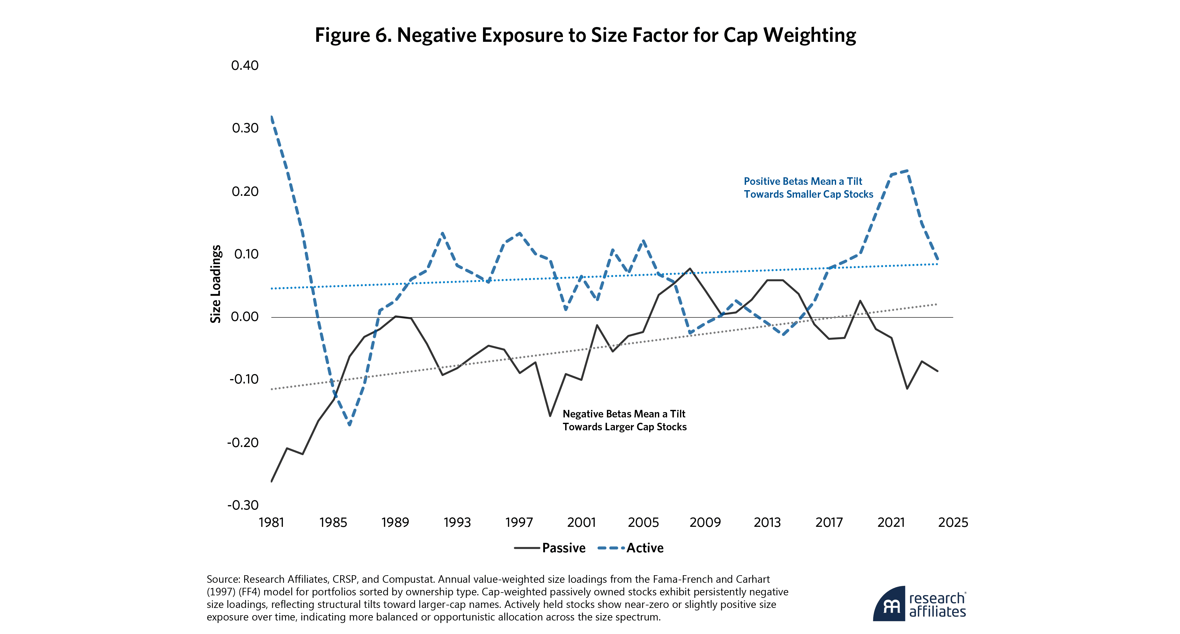 Stocks for which market capitalization materially exceeds fundamental size are assigned to the Passive portfolio, reflecting the active positioning of valuation-indifferent flows. Conversely, stocks for which fundamental size surpasses market cap are assigned to the Active portfolio, reflecting the active positioning of systematically rebalanced portfolios.