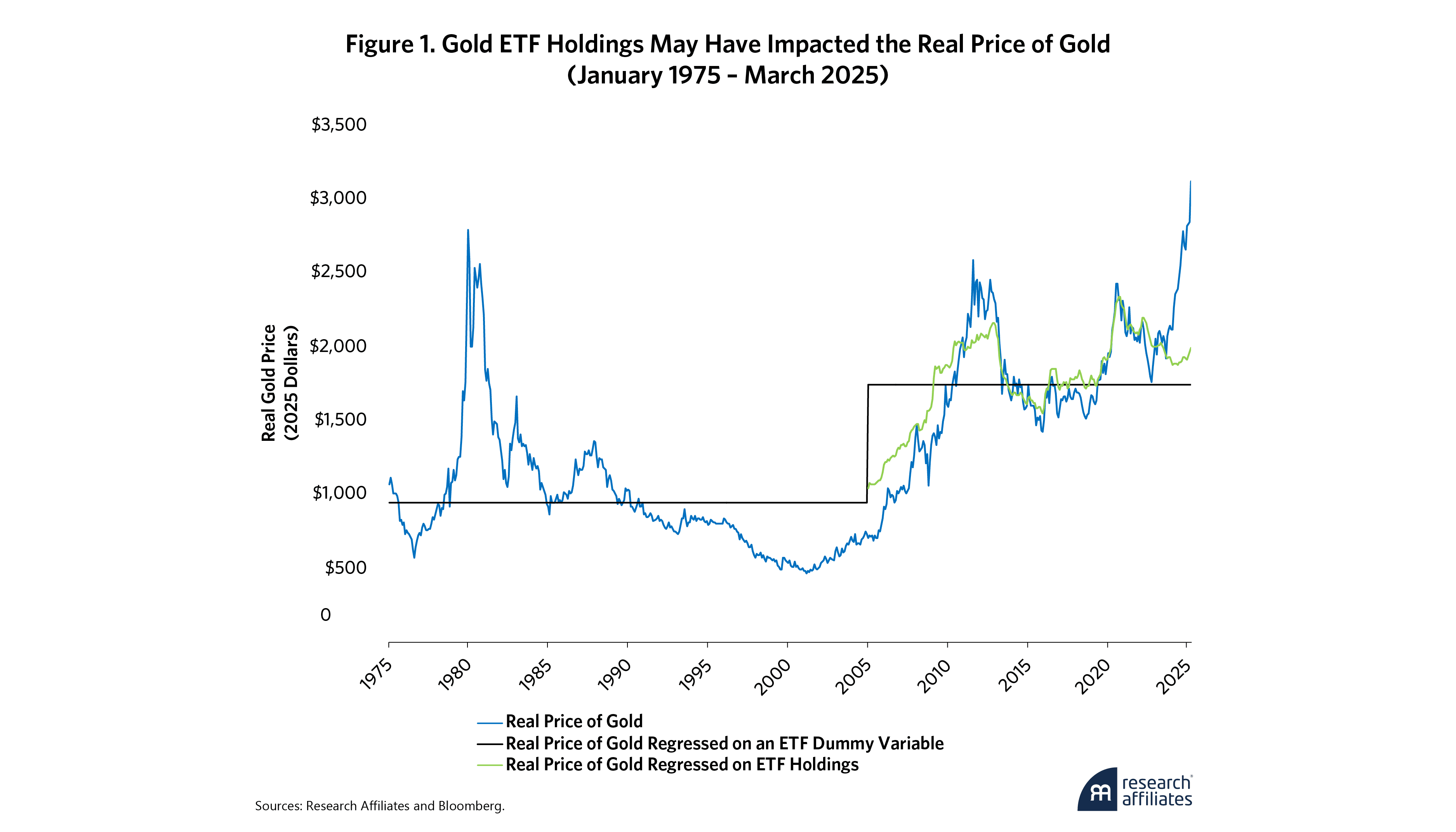 Figure 1 shows the relation between the real price of gold and the amount of gold held by SPDR Gold Shares (GLD) and iShares Gold Trust (IAU), the two top gold-owning ETFs, as measured in troy ounces, which are about 10% heavier than traditional ounces. The real gold price is the nominal price of gold divided by the CPI. This represents the price of gold in 2025 dollars.
