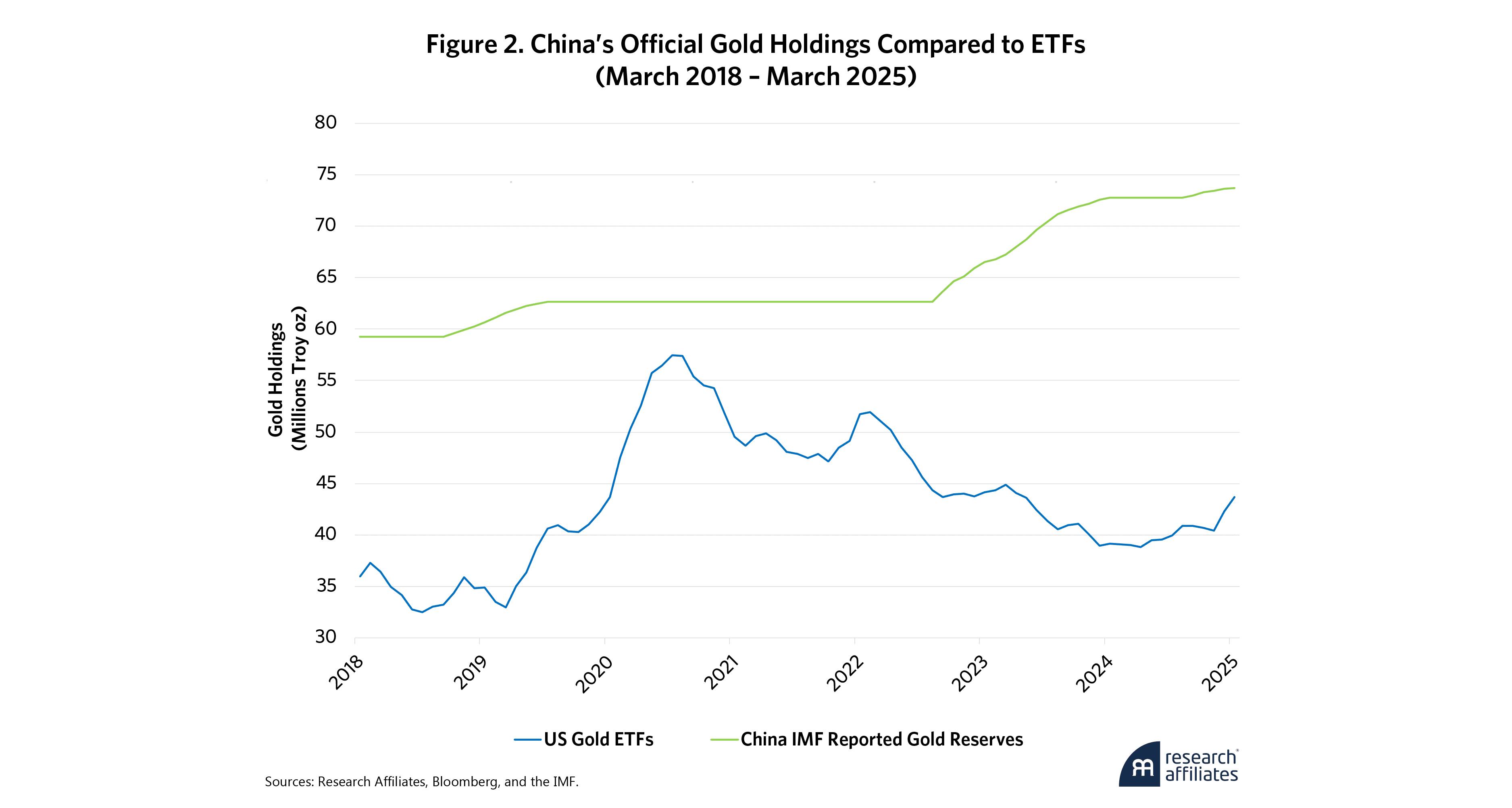 Figure 2 shows China’s gold holdings next to those of gold ETFs. As the gold holdings of ETFs have stalled or declined since their peak during the COVID-19 pandemic, China’s de-dollarization-related purchases have picked up the slack. Importantly, Figure 2 reports the “official” holdings. Many believe that China has conducted significant non-official accumulation of gold as well. Indeed, it is in China’s best interest not to pre-announce a significant buying program—which would immediately increase the price of gold.