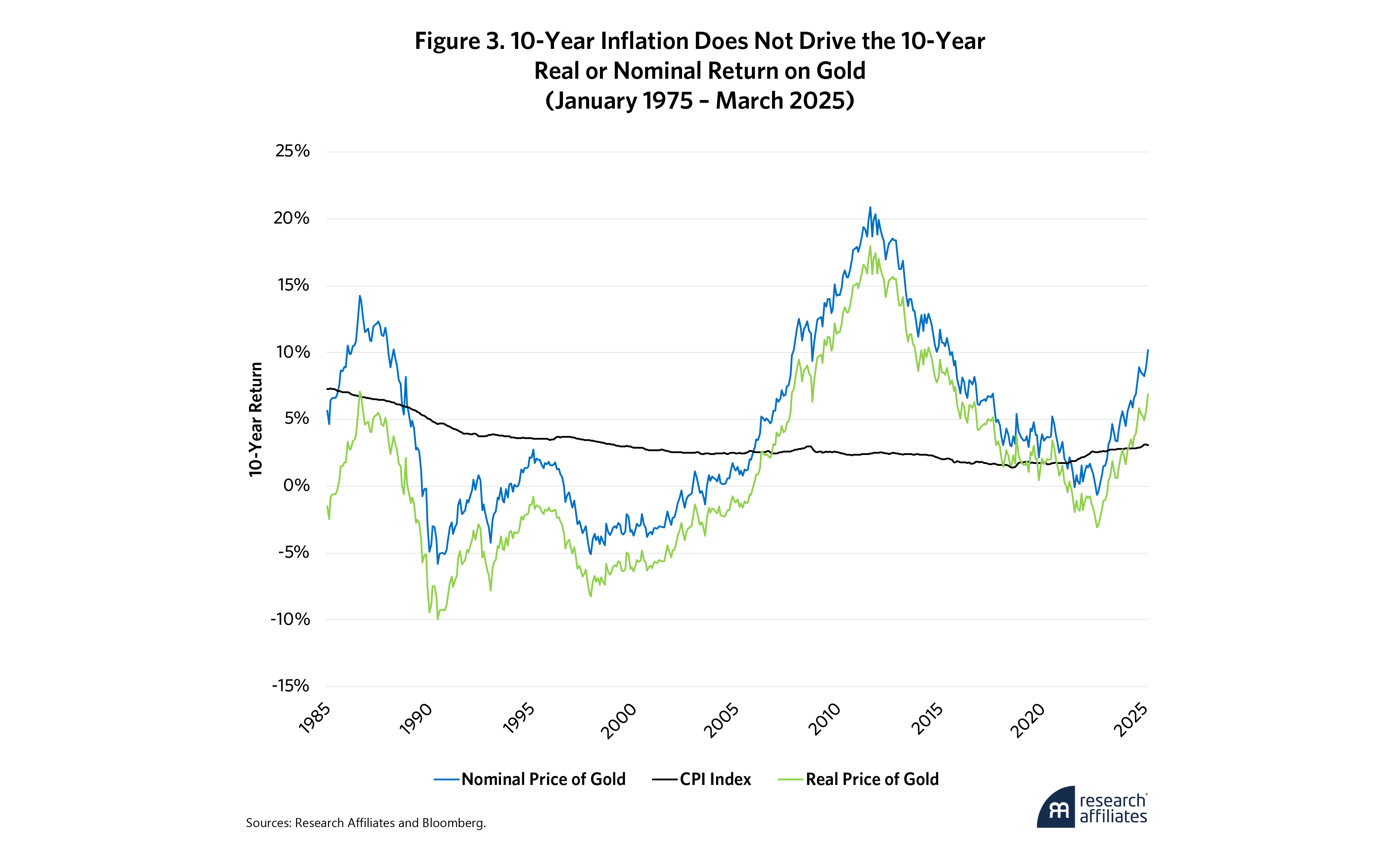 The difference in the volatility of gold and inflation is starkly represented in Figure 3, which compares 10-year gold returns with the 10-year inflation rate. The sample starts in 1975, when U.S. investors were once again permitted to own and trade gold following the enactment of Public Law 93-373.3 The blue line represents the inflation rate, the CPI, which the real and nominal prices of gold should have tracked—assuming gold is a perfect inflation hedge. But, in fact, gold prices indicate little if any correlation to the 10-year inflation rate.