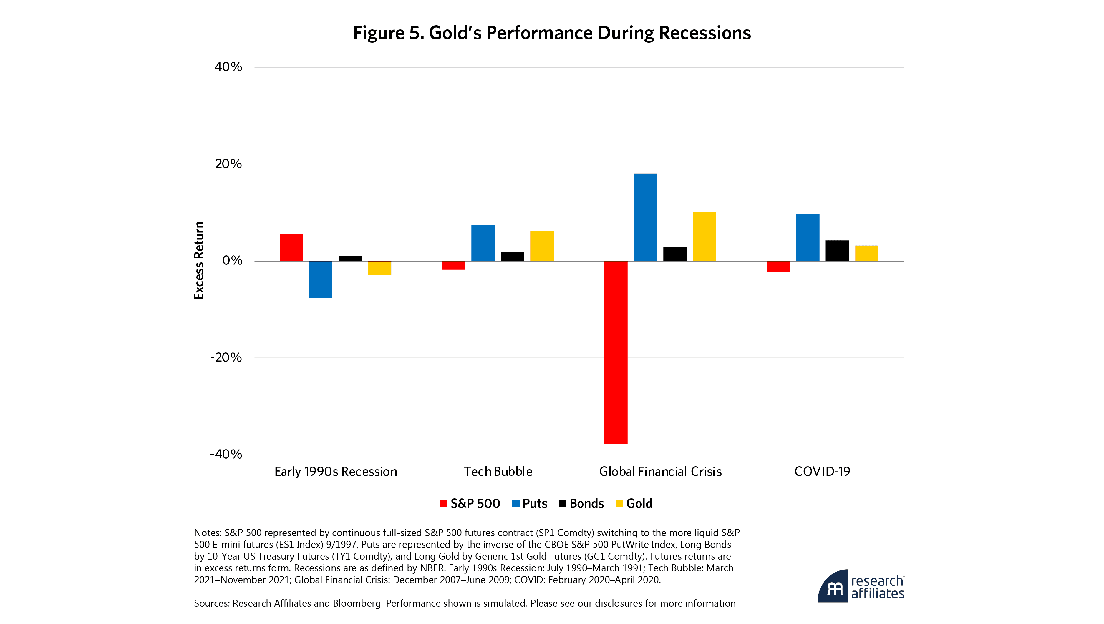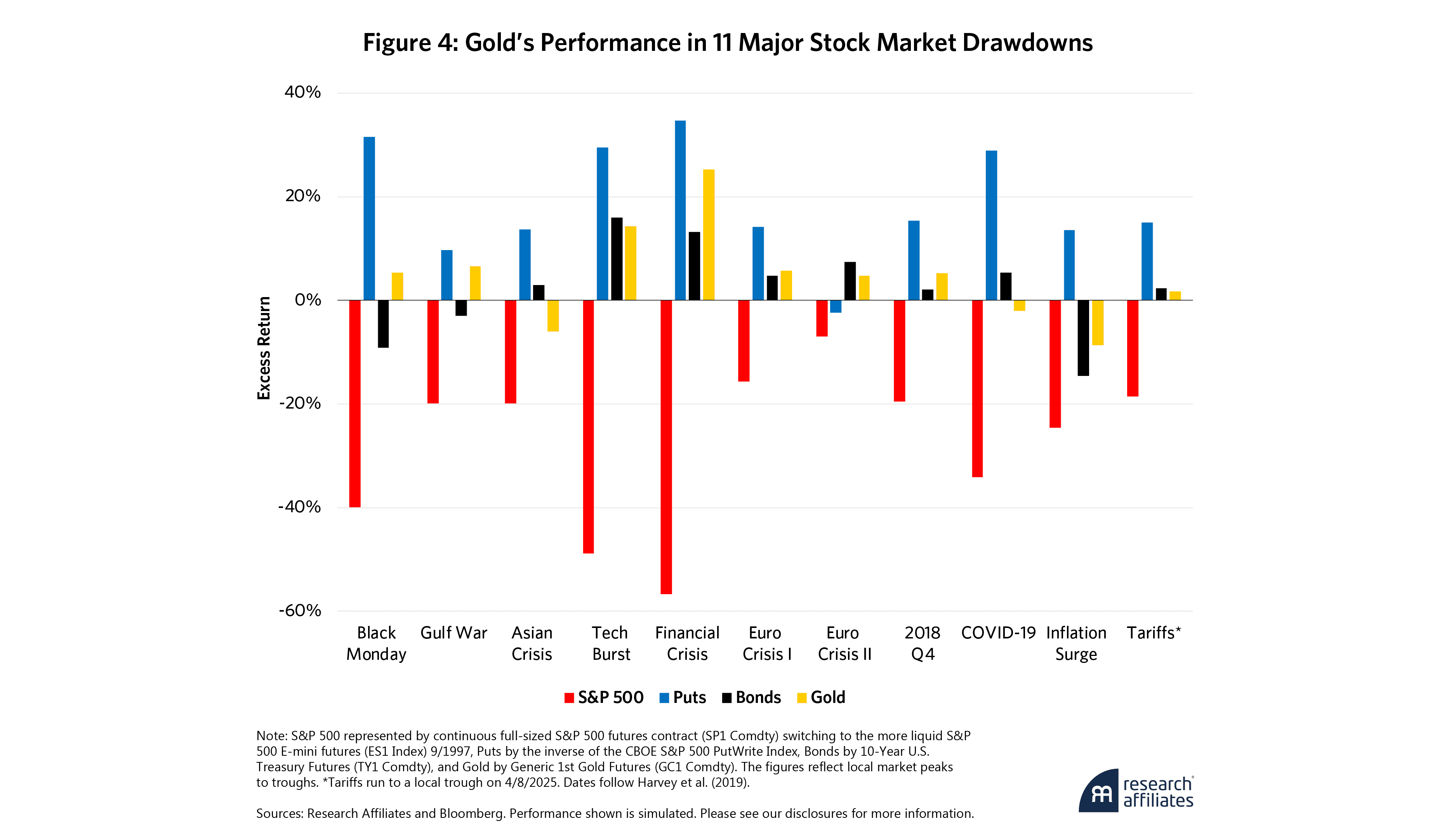 To find out, we consider gold’s performance in the 11 major stock market drawdowns.4 For comparison, we also include two additional hedging candidates: Treasury bonds and S&P 500 puts taken 5% out of the money. Figure 4 shows that the price of gold went up in eight of the 11 S&P 500 drawdowns. In the remaining three, the price fell but the drop was far smaller than the S&P 500’s. Thus, gold provided some diversification benefit and could indeed be a valuable hedge against stock market volatility in the current environment.