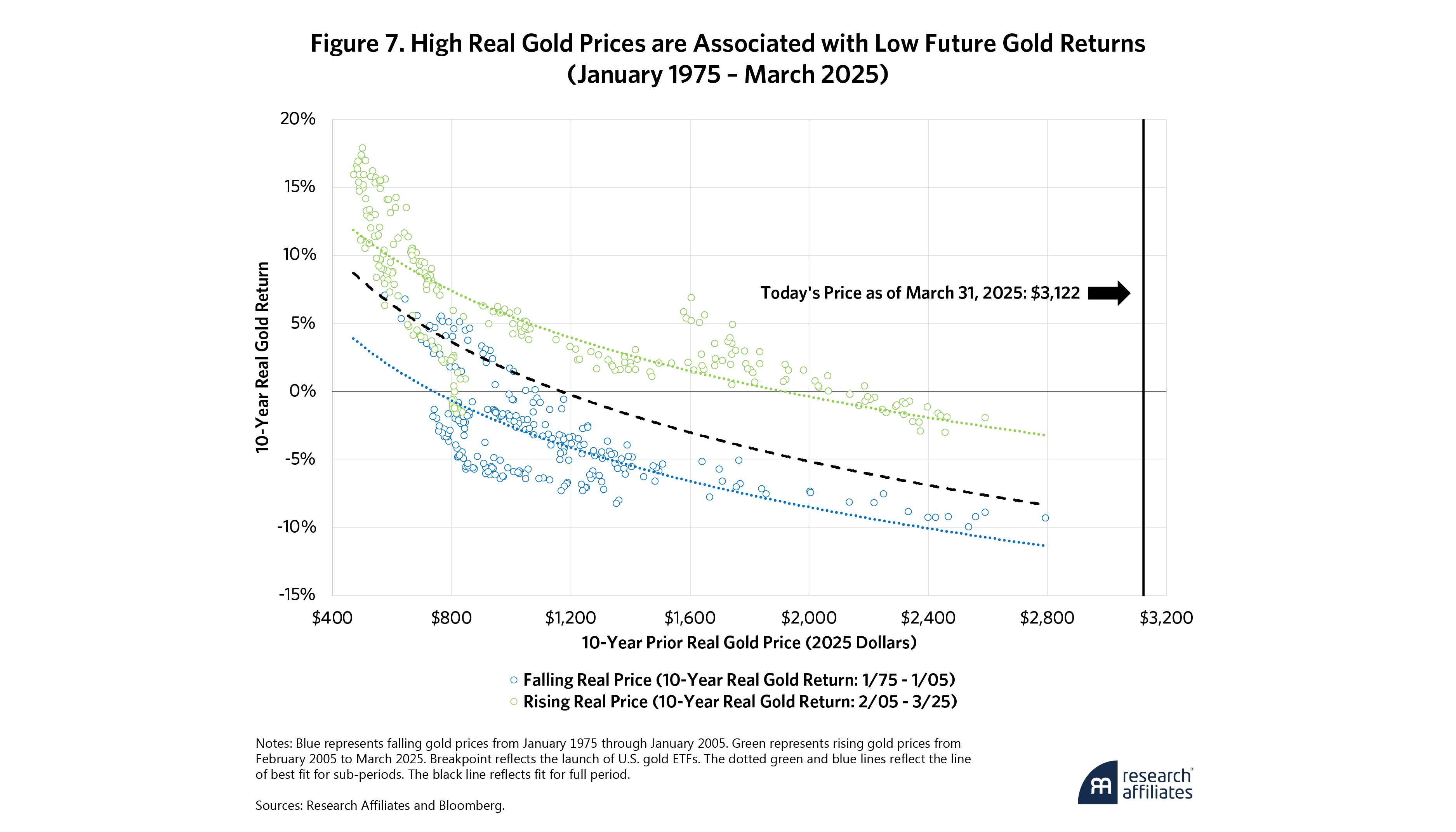 Currently, gold prices are at or near all-time highs. If gold prices revert towards the mean, they may not offer much in the way of protection. Looking back, gold’s performance in the years following price peaks has tended to be low or even negative. Figure 7 shows that 10-year real gold returns are low following highs.