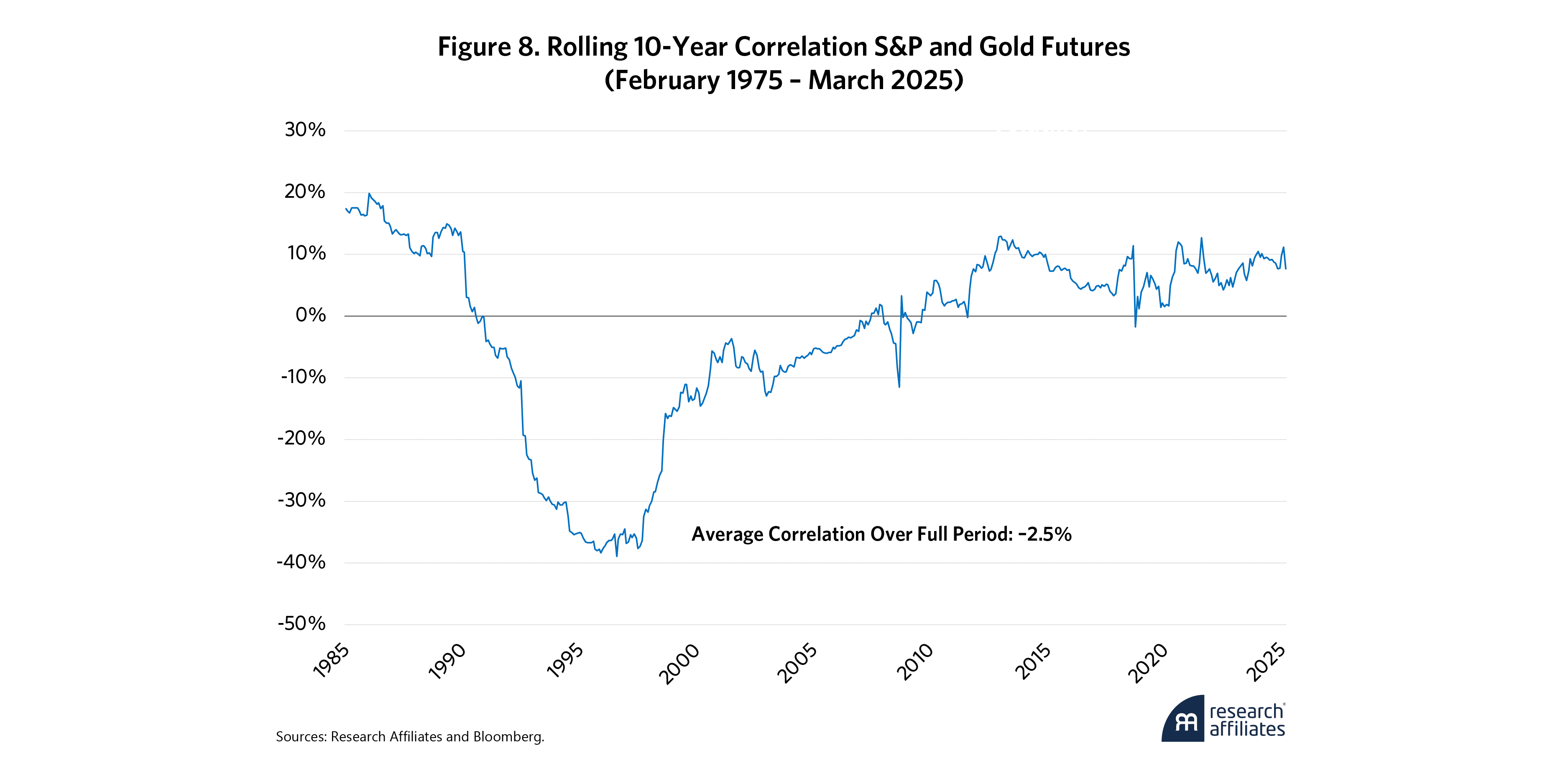 Certain key points are worth remembering. The first and most obvious: Gold is volatile—as volatile as the S&P 500. But while it may not offer reliable protection against inflation, gold is relatively uncorrelated to the stock market. Figure 8 shows the average correlation is near zero. While the correlation has increased over the past 25 years, it is less than 10% today.