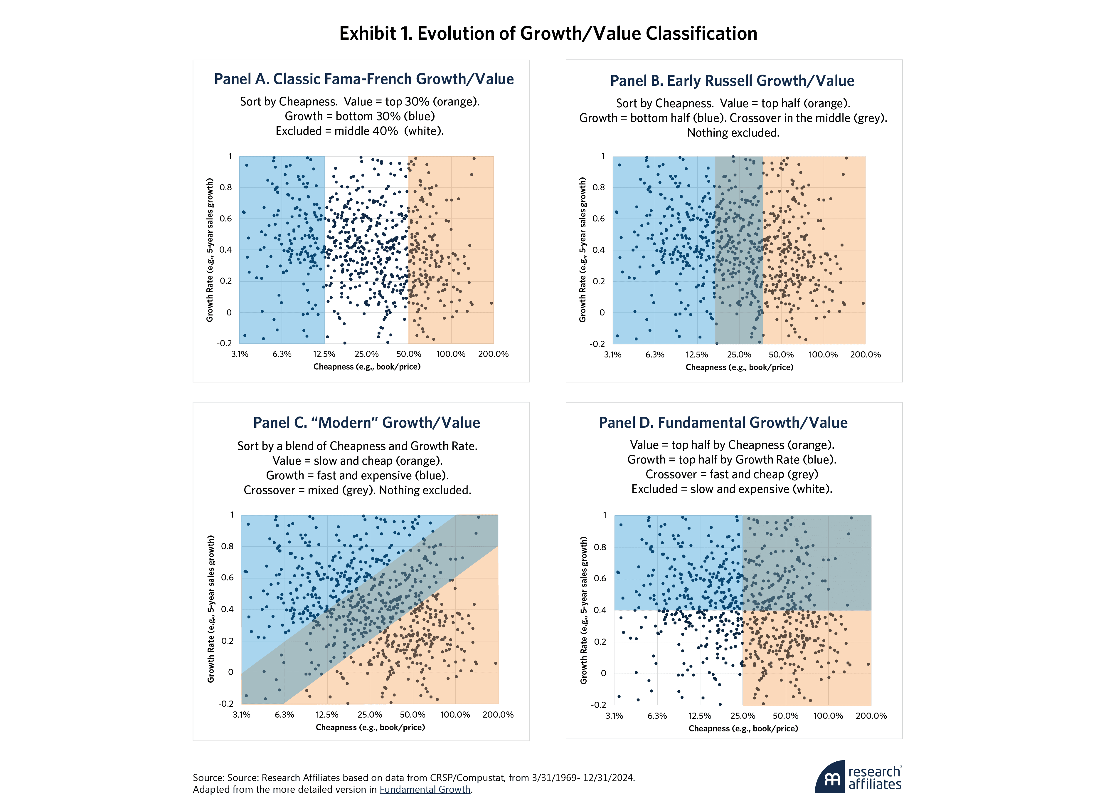As shown in Panel C, today’s standard—true for Russell, MSCI, S&P, and FTSE—looks for some combination of fast growth and high valuation multiples to populate the growth universe and some blend of slow growth and cheap valuation multiples to define value. The duality is preserved—stocks must be growth, or value, or a blend.