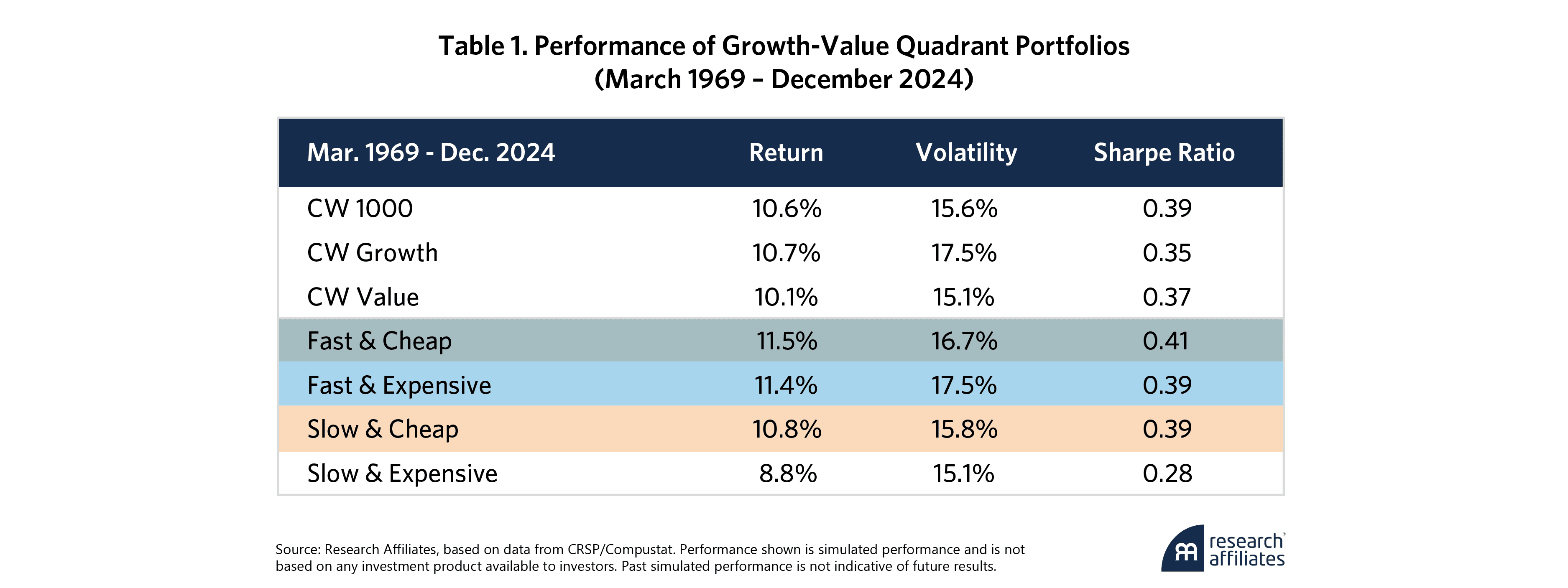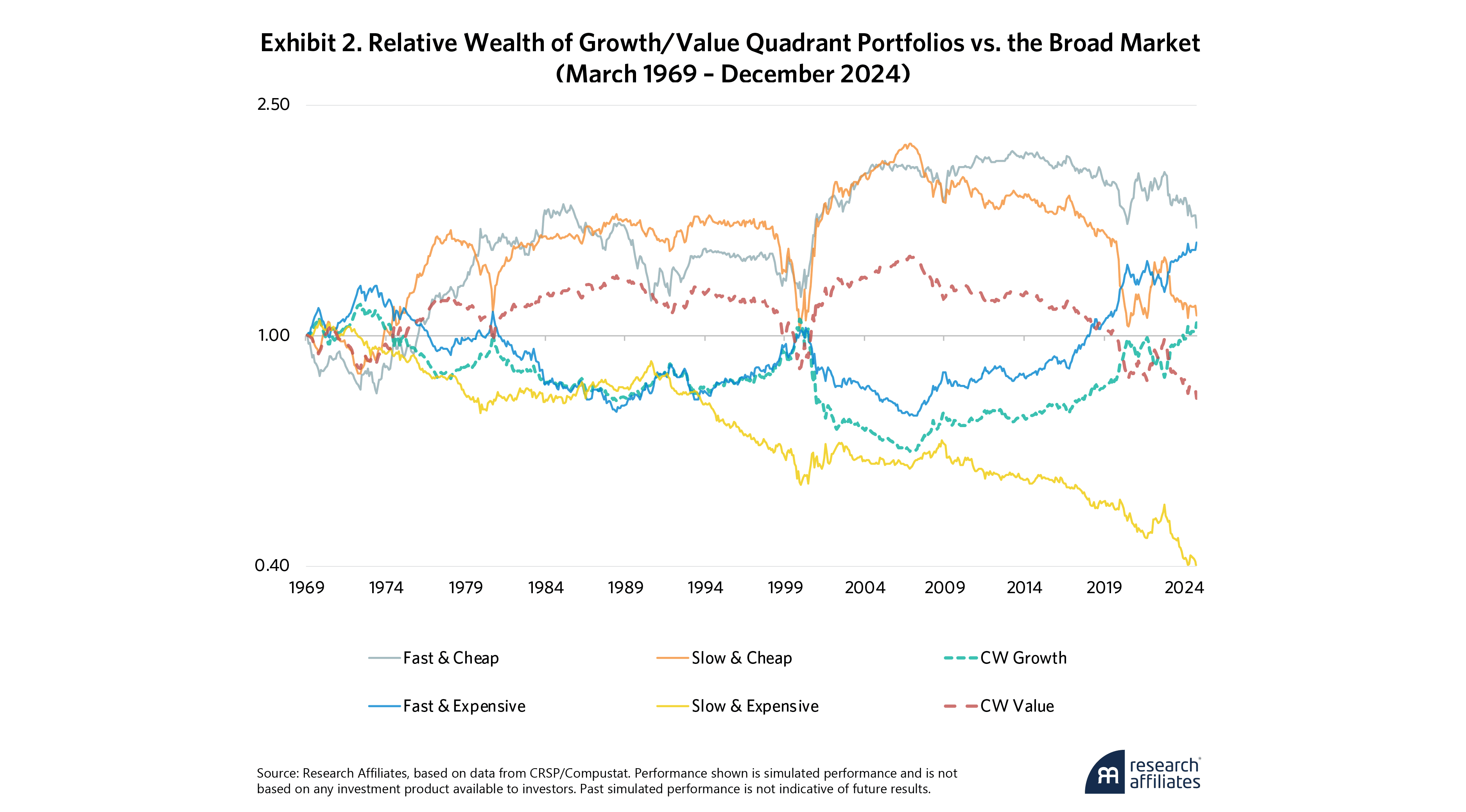 Table 1 summarizes the average performance of the benchmarks and the four growth/value quadrant portfolios. Over this period, the portfolios shaded blue, grey, and orange delivered Sharpe ratios roughly in line with that of the broad market. In sharp contrast, the Slow & Expensive portfolio posted meaningfully weaker results, underperforming the market by 1.8% per year (over a 55-year span!), with a Sharpe ratio substantially below that of the market and the other portfolios.