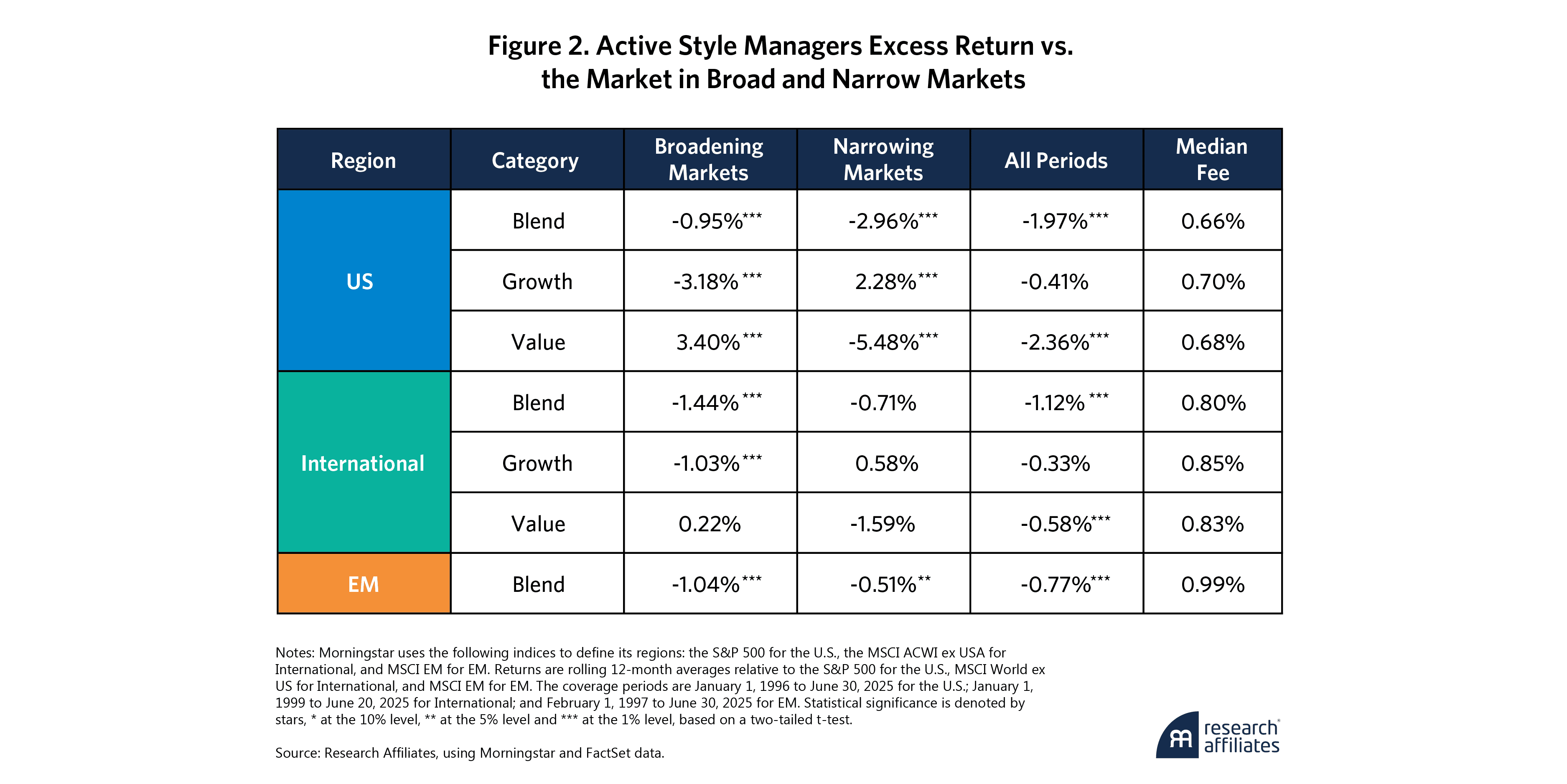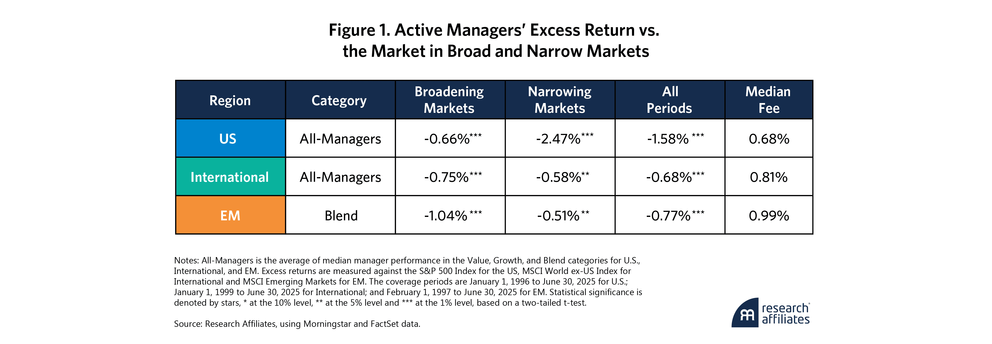 Conventional wisdom holds that active managers should outperform in broad markets and struggle in narrow ones. But our research shows the median active manager lags their benchmarks in both environments.