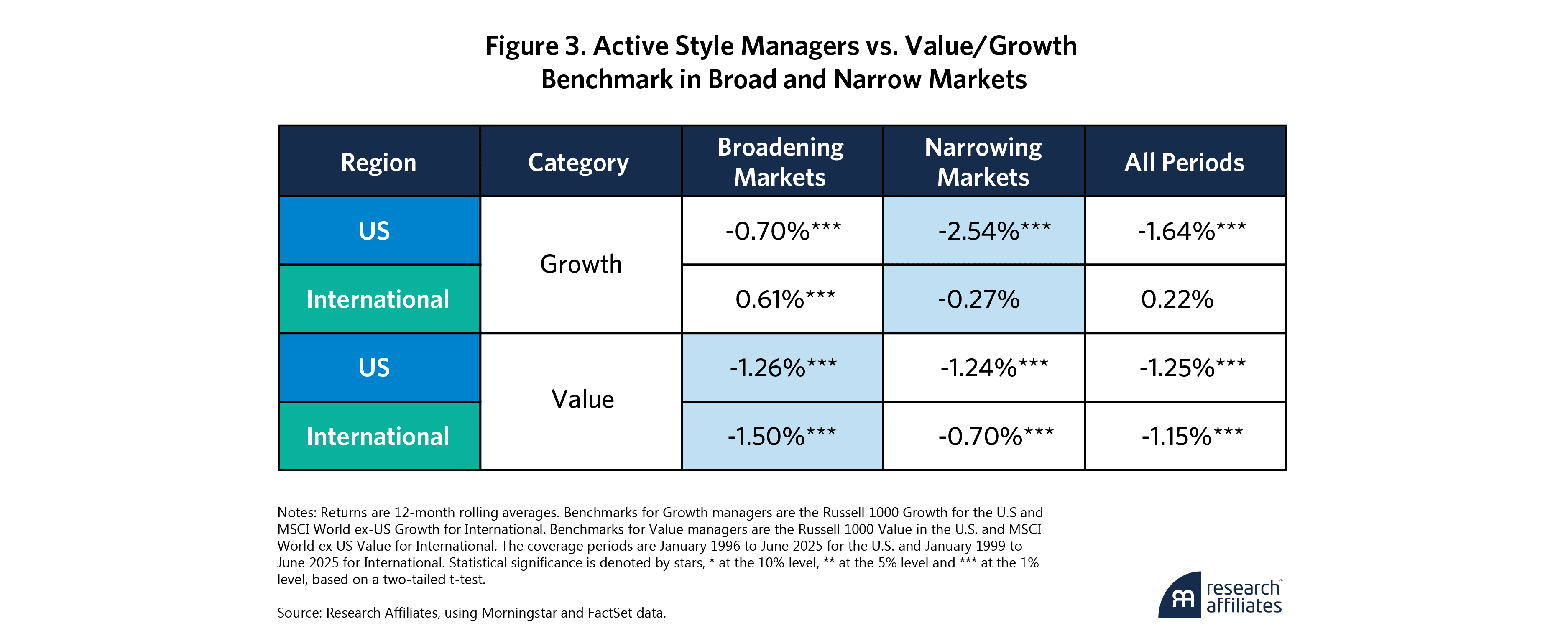 If active Value managers do better in broadening regimes and Growth managers in narrowing ones, a natural question arises: If an investor could accurately time these style shifts, would the potential outperformance justify active management’s costs? In short, no. Figure 3 compares the excess returns of active Value and Growth managers relative to their benchmarks. Despite favorable conditions, active managers often underperform even simple style benchmarks precisely when they should be at an advantage.