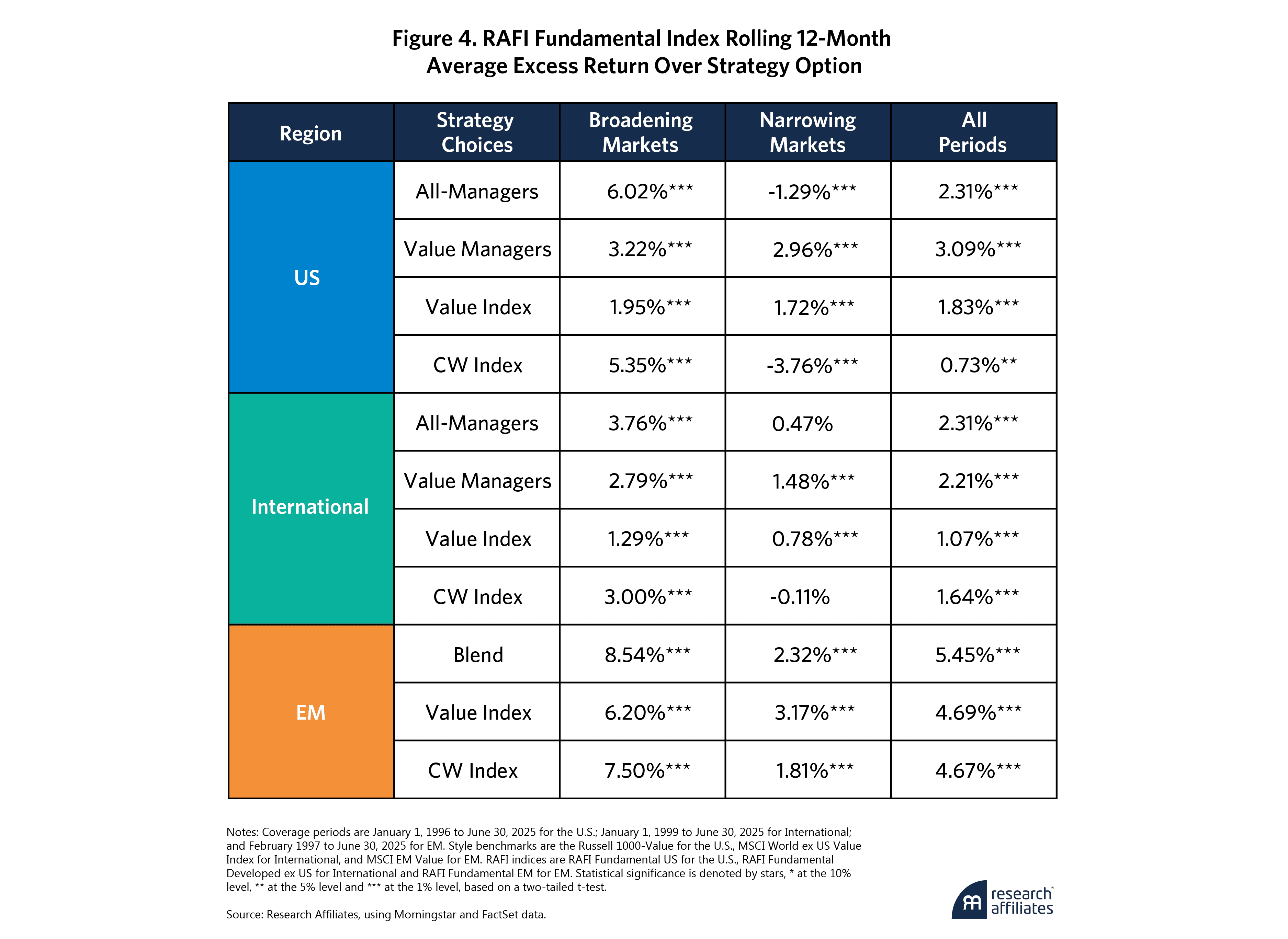 International evidence only solidifies the case for RAFI’s simple, systematic approach over active management teams in all market regimes. Whether compared to all managers or value managers, RAFI handily beats both, running ahead by 231 bps and 221 bps, in International markets. In difficult, narrow markets, RAFI adds 148 bps over Value managers on average and 78 bps over the MSCI World ex US Value Index. Against the market-cap index, RAFI averages 300 bps in excess returns during broadening regimes while subtracting a scant 11 bps during narrowing markets. Combined, RAFI’s “all-weather” versatility yields 164 bps in gains on average over all 12-month spans between 1999 to 2025.