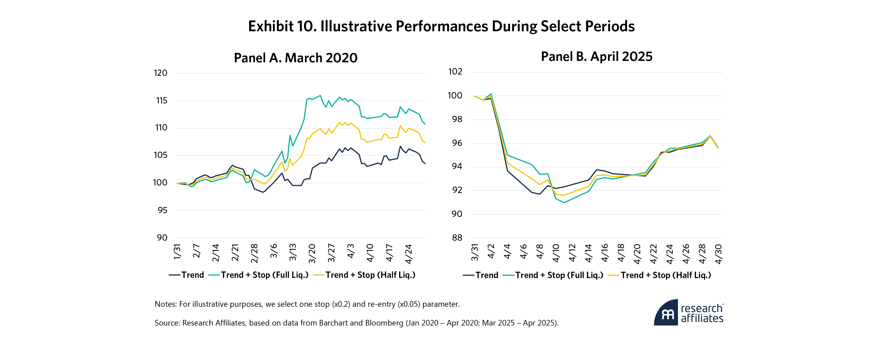Exhibit 10 reiterates that stop losses are imperfect tools. While stop losses would have added value to a trend-following strategy during the COVID-19 market turbulence (Panel A), they would have been net-even during the April 2025 drawdown (Panel B), particularly after missing the significant post-“Liberation Day” upswing as the combative trade rhetoric subsided. These findings are a good reminder that stop losses may not benefit all strategies all the time.