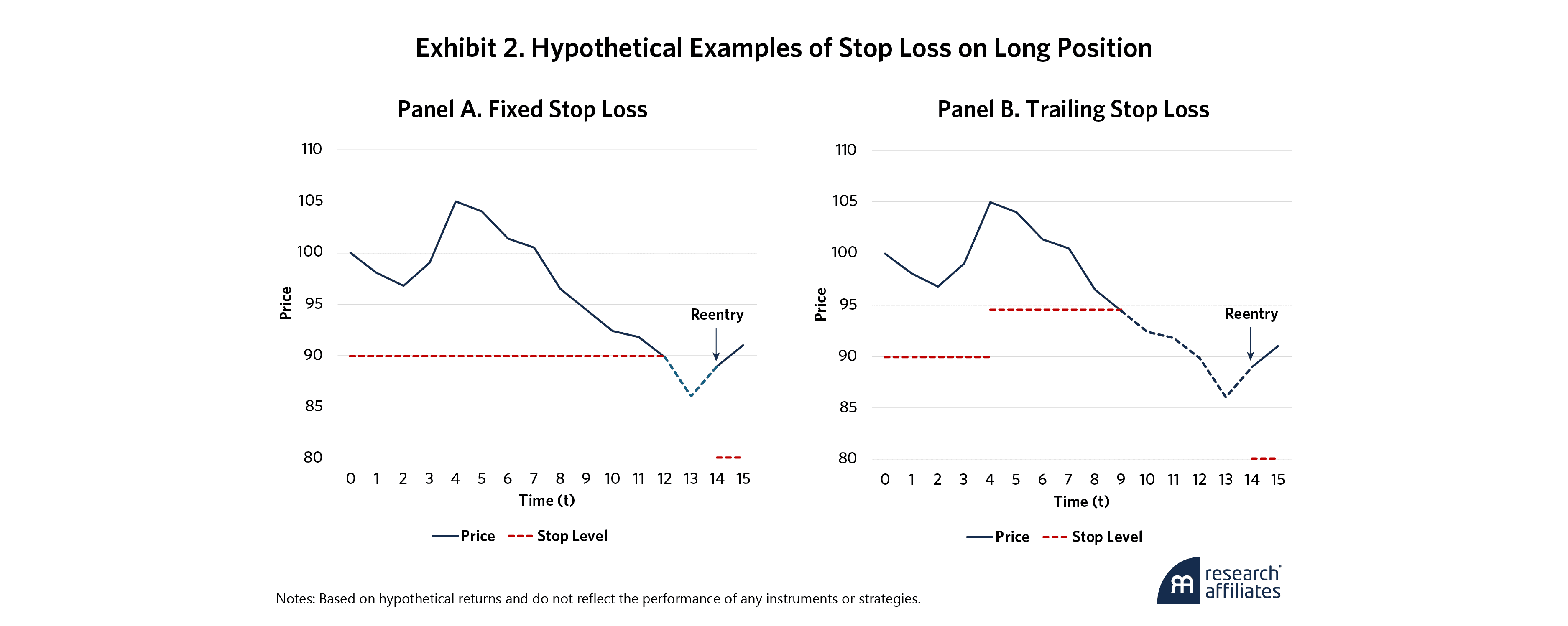 A stop loss is determined by the level at which the position will be closed. For a long position, that is the price at which the investor will sell the instrument. For a short position, it is the reverse. Exhibit 2 shows another important but less-discussed stop-loss parameter: the reentry level. While the stop level reflects the investor’s loss threshold, the reentry level sets the price at which the investor will reopen the position. For long (short) positions this is typically preceded by observation(s) of positive (negative) returns to ensure the position is moving in the desired direction.