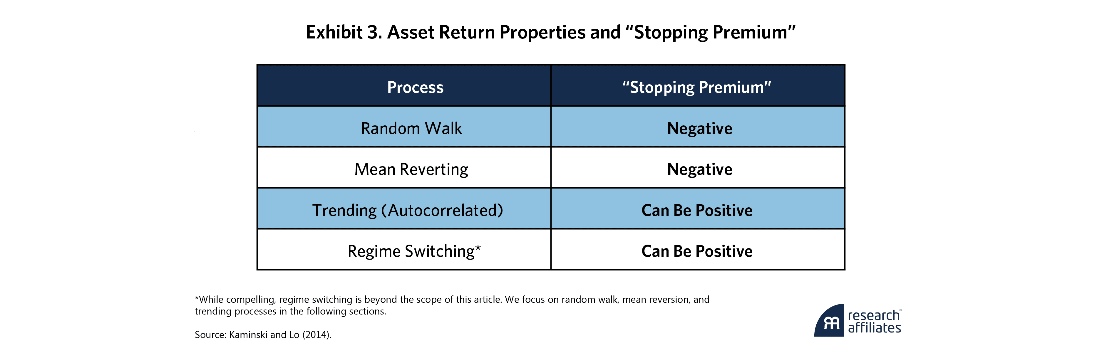 In their seminal paper, Kaminski and Lo (2014) describe the environments in which stop losses mitigate and lock in losses. Specifically, they highlight how stop losses can influence a strategy’s expected returns (“stopping premium”) based on the assumptions underlying the asset’s returns (i.e., return-generating processes). Exhibit 3 shows the various processes and the associated “stopping premium.”