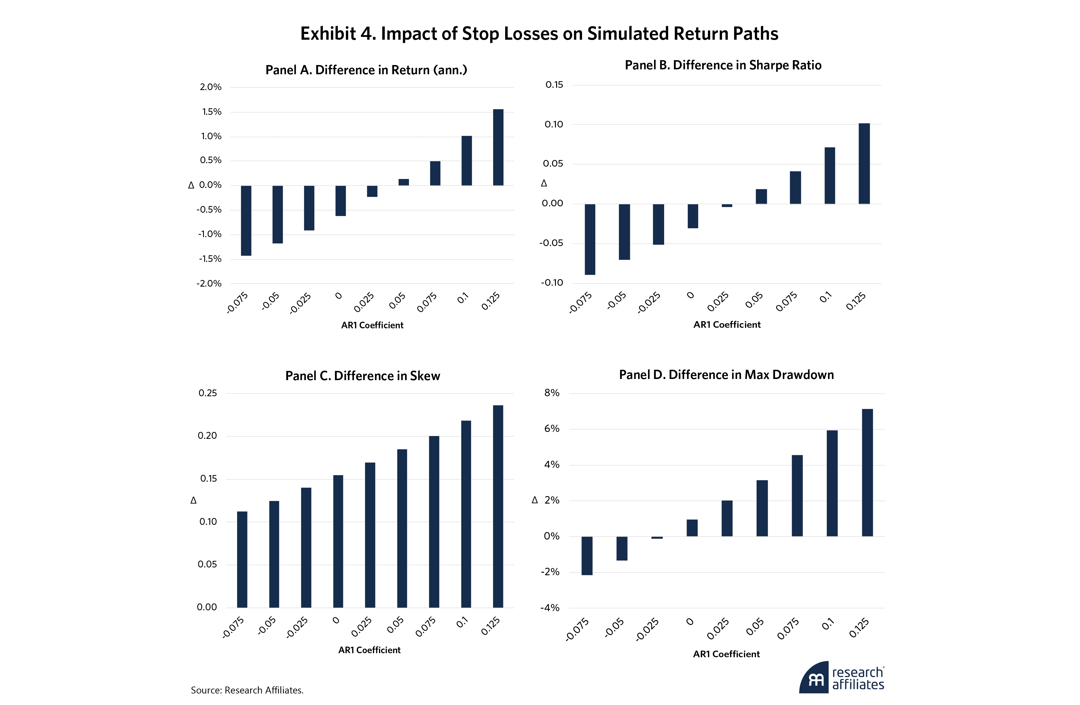 The risk benefits, on the other hand, are more intriguing. Skewness improves for all values of Φ (Panel B). This implies that stop losses shift the return distribution by reducing either the size or frequency of left tail events, an attractive outcome given the risk-management application that motivated our stop-loss framework. Maximum drawdown differences (Panel C) also suggest that stop losses may even have benefits at Φ = 0 (random walk), which is encouraging if we take the conservative view that the strategy’s returns are completely unpredictable.