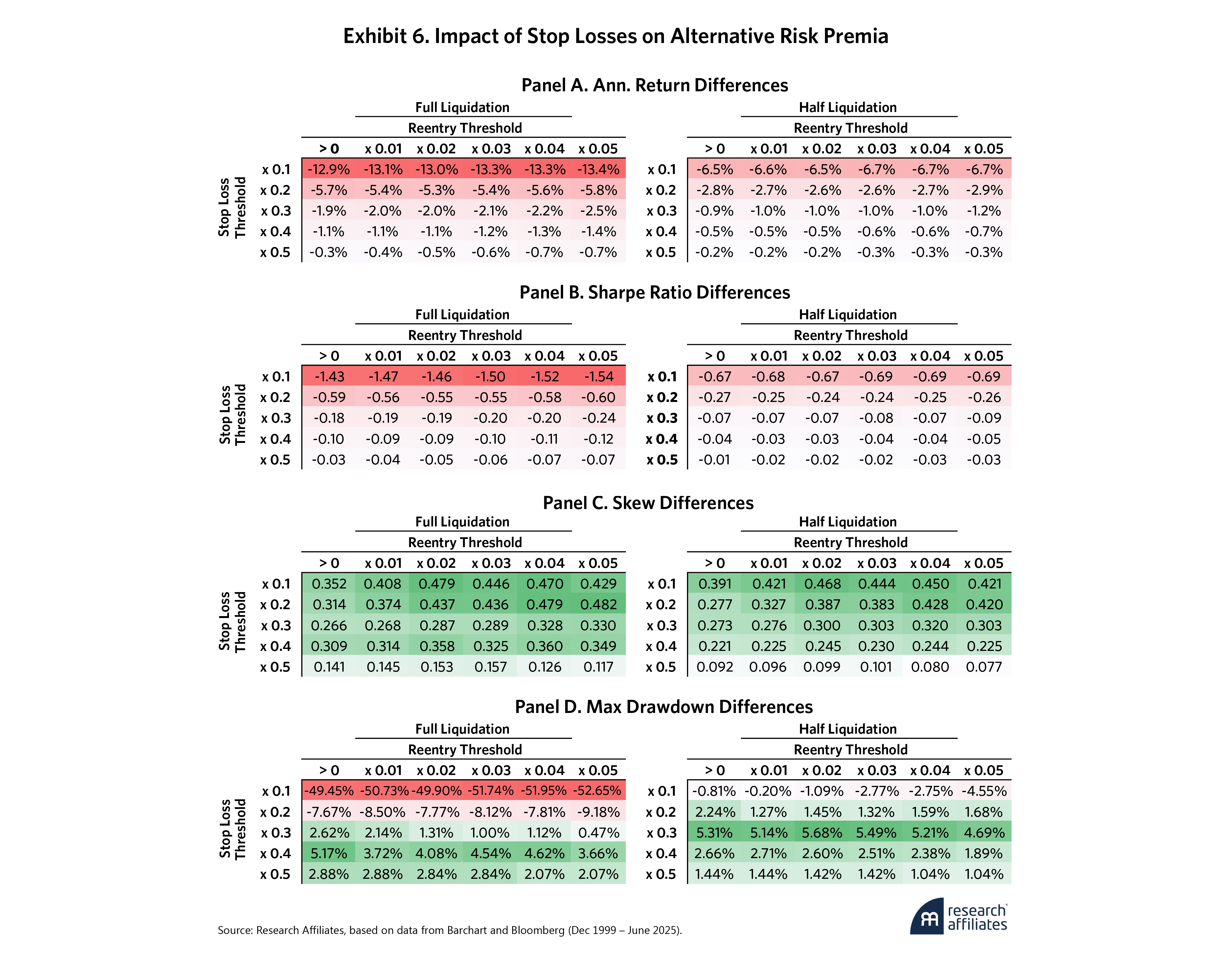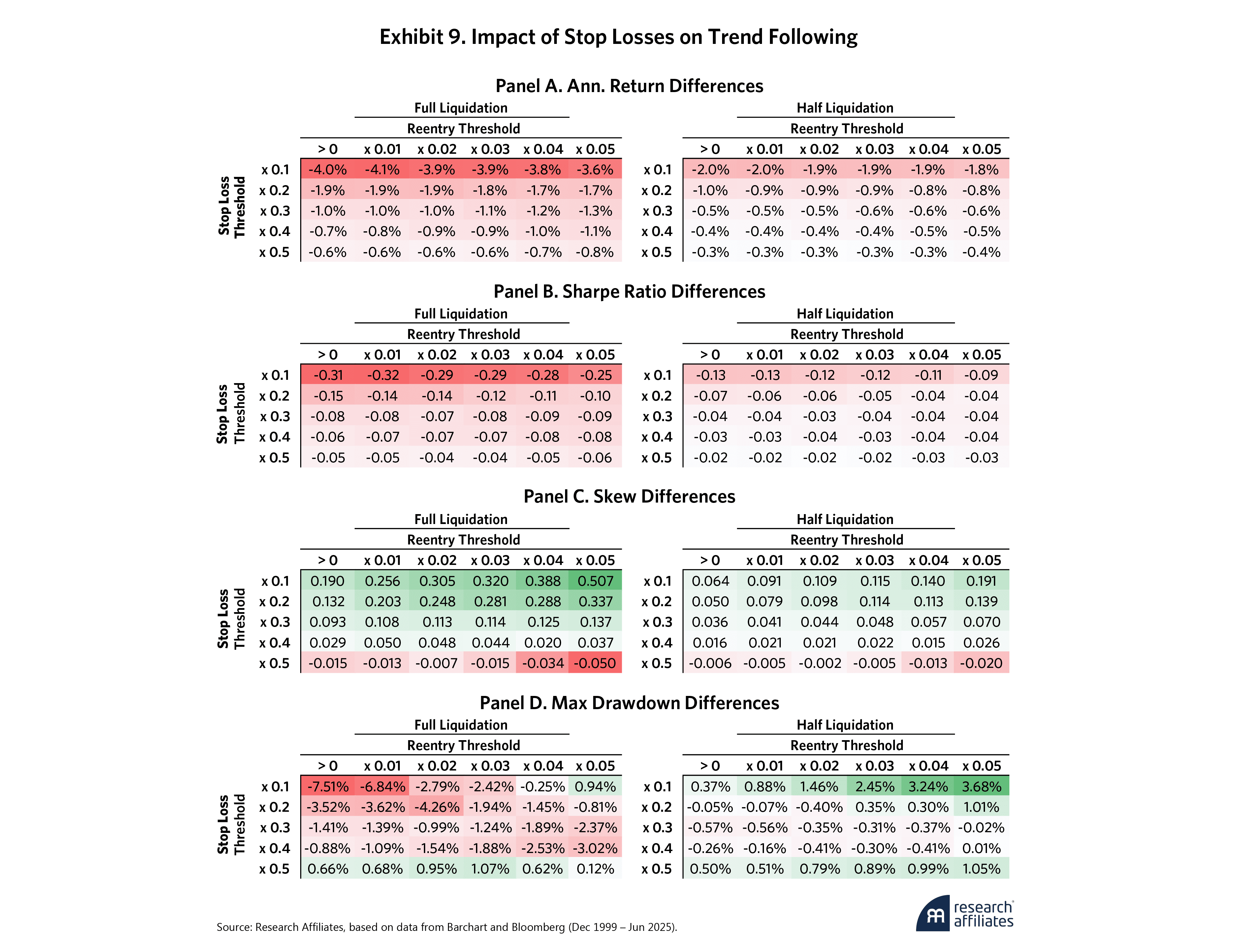 The results are in line with our simulated return paths. No stop-loss parameter improves the returns or Sharpe ratios on a net-of-cost basis (Panel A and Panel B). At extremely tight stop losses (e.g., x0.1), excessive trading creates significant trading friction such that at full liquidation/reentry, the results are strategies with negative Sharpe ratios (recall Exhibit 5’s original Sharpe ratio: 0.93). At more modest thresholds (e.g., x0.3 and higher), however, the performance decline becomes minimal, particularly at half liquidation.