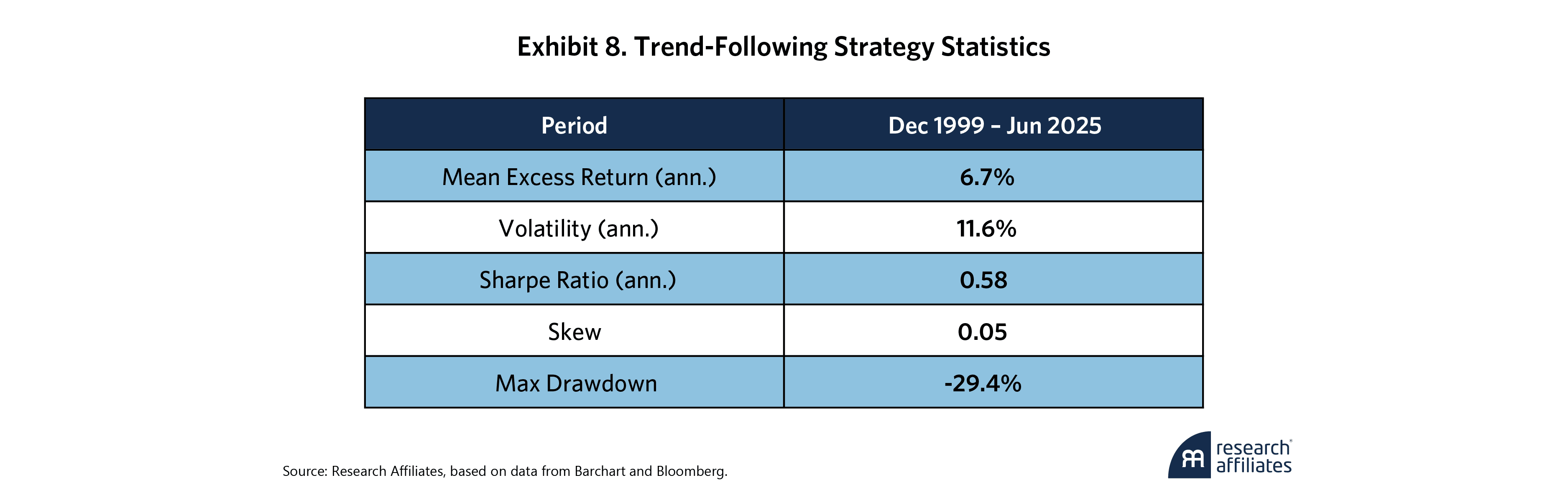 Our trend-following strategy also employs a simple signal and portfolio construction methodology. We apply a one-year (252-day) momentum signal based on which we take directional positions on each of 71 total instruments. All positions are equal-volatility weighted at 10%. Exhibit 8 shows the summary results.