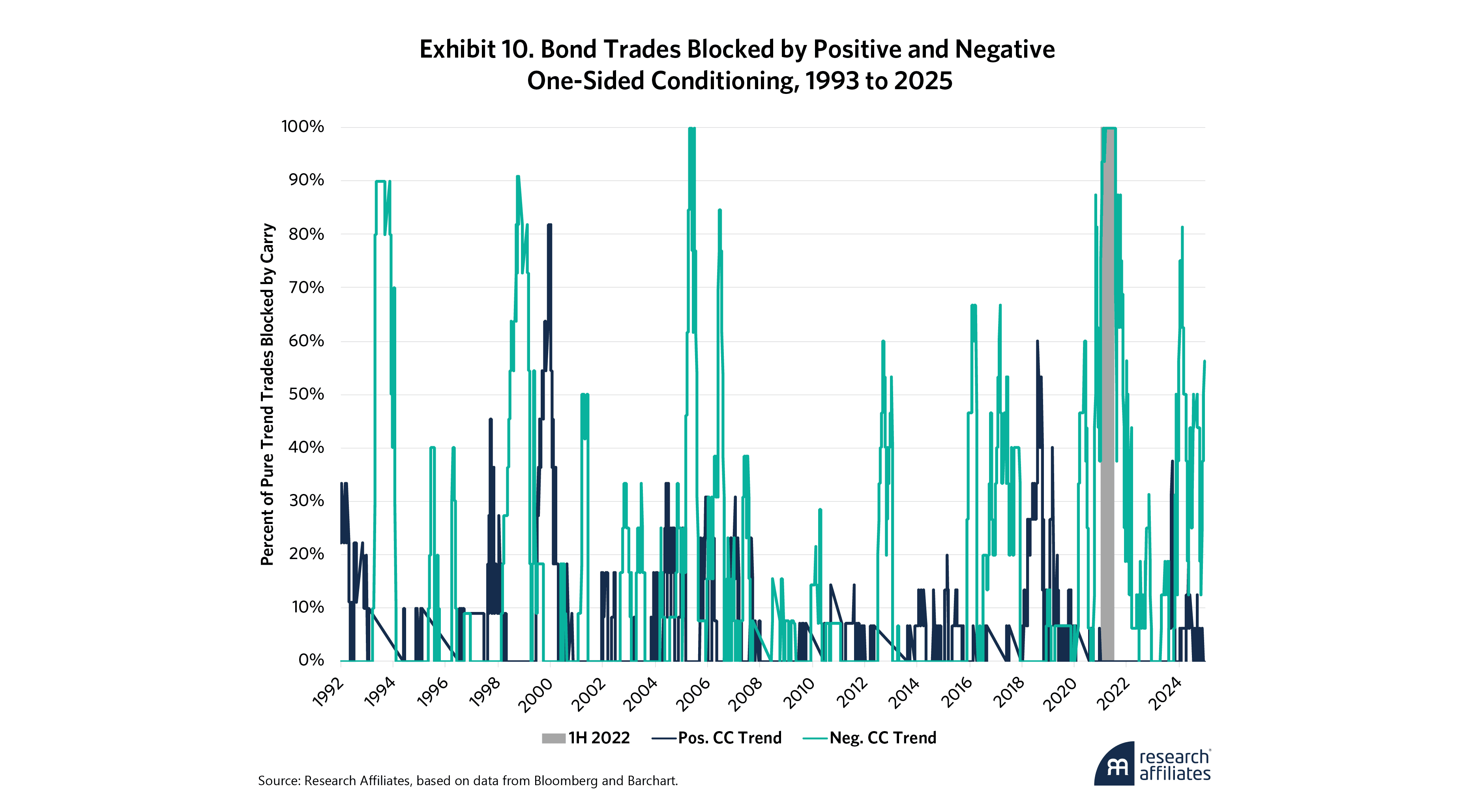 Exhibit 8’s granularity nonetheless masks the issues with bonds in 2022. How much did the filter affect bonds during the first half of 2022? Exhibit 10 shows the percentage of trades blocked by both positive and negative one-sided conditions; the spike in the first half of 2022 for Neg. CC Trend drove the underperformance. Exhibit 13 in the Appendix shows the percentage of trades blocked by the positive and negative filters for all asset classes.