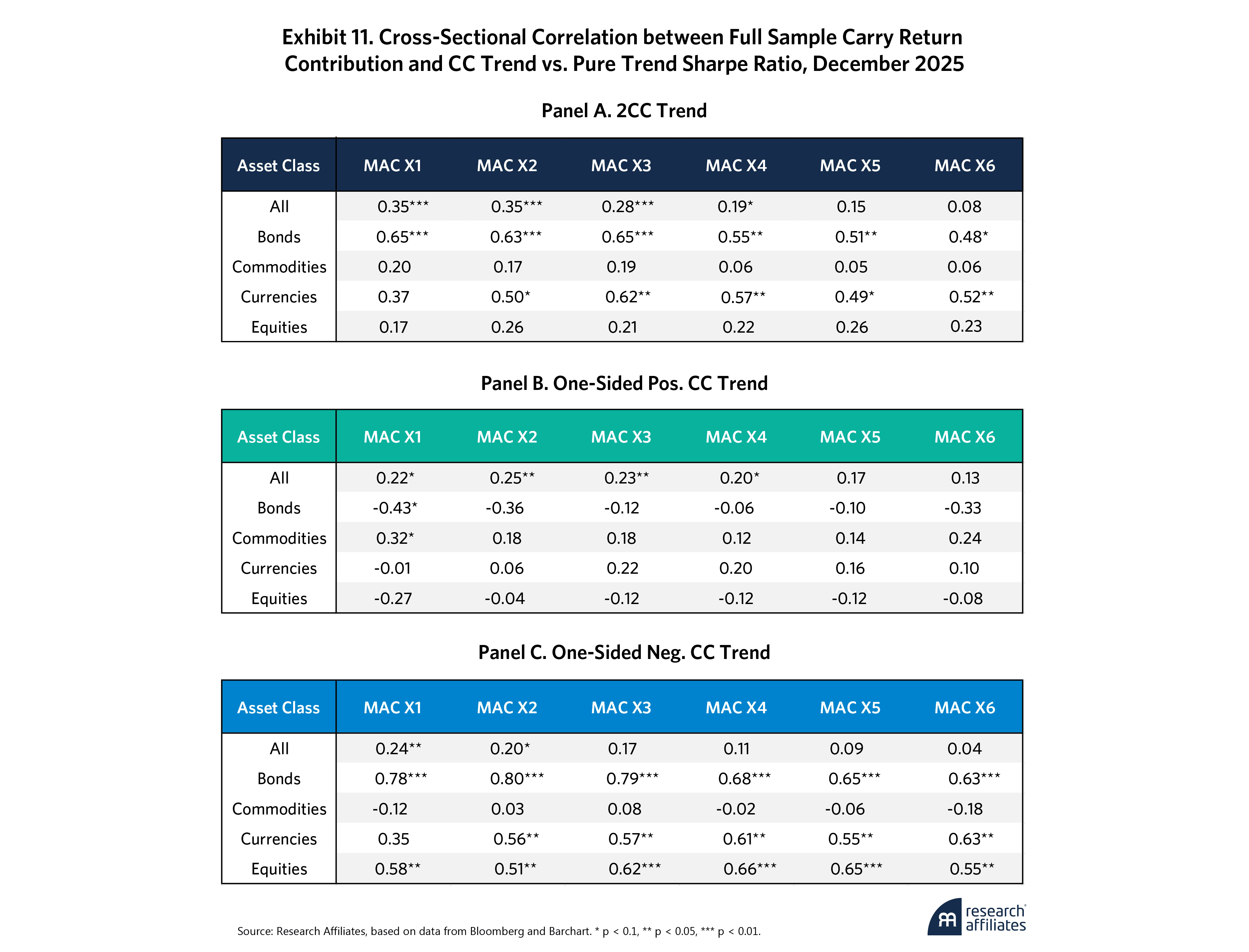 Trend and carry also have at least a marginally stronger relationship for shorter-term trend signals. CC Trend performs better for X1 than for the longer-term X6 across all asset classes and bonds in particular. For example, Panel A – the most comprehensive view – indicates a statistically significant correlation for MAC X1 to X3, but this correlation evaporates for the MAC X5 and X6 signals. The results are more mixed, however, for individual asset classes due to their smaller sample sizes.