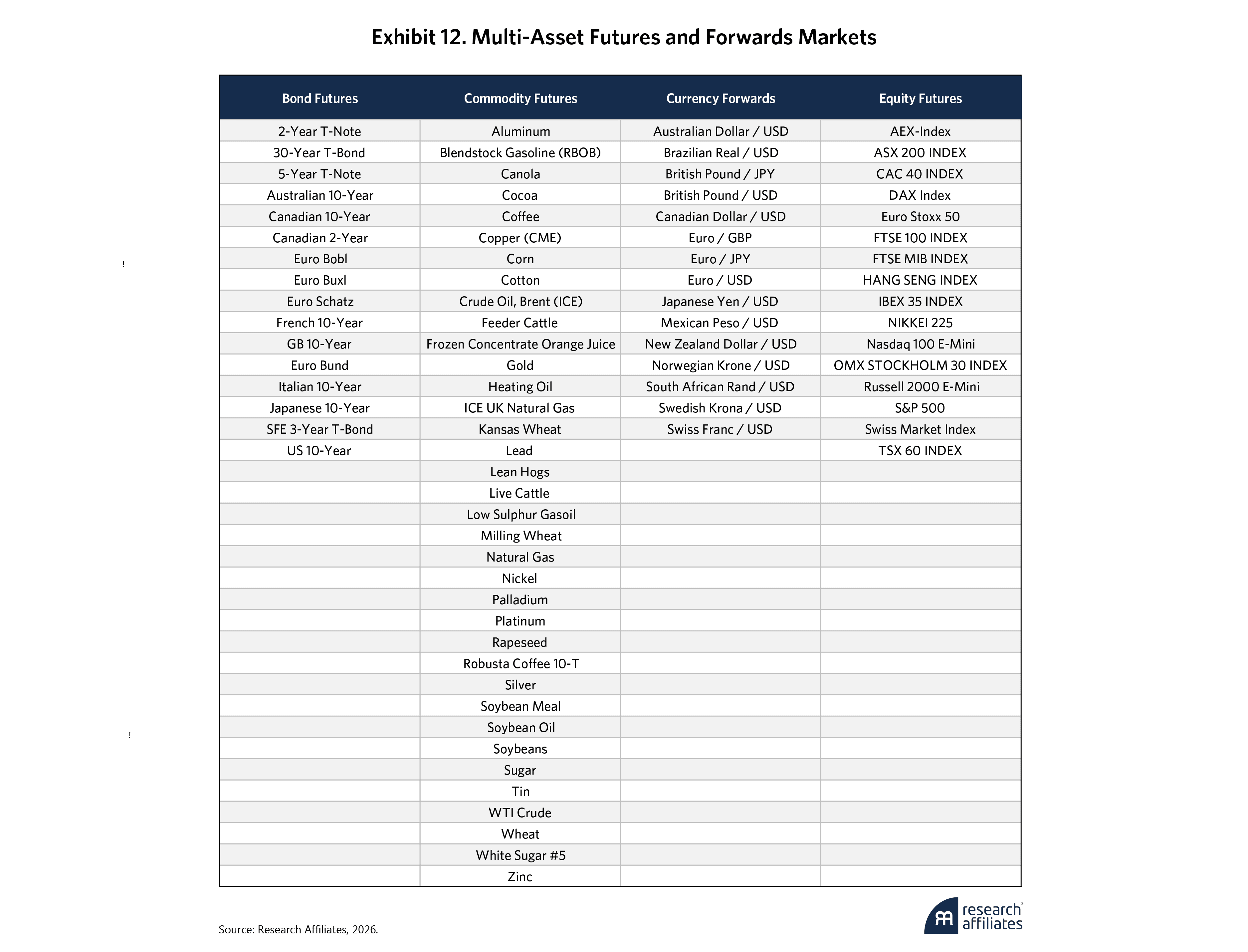 Exhibit 12 documents the 83 multi-asset futures and forwards we consider in this article.