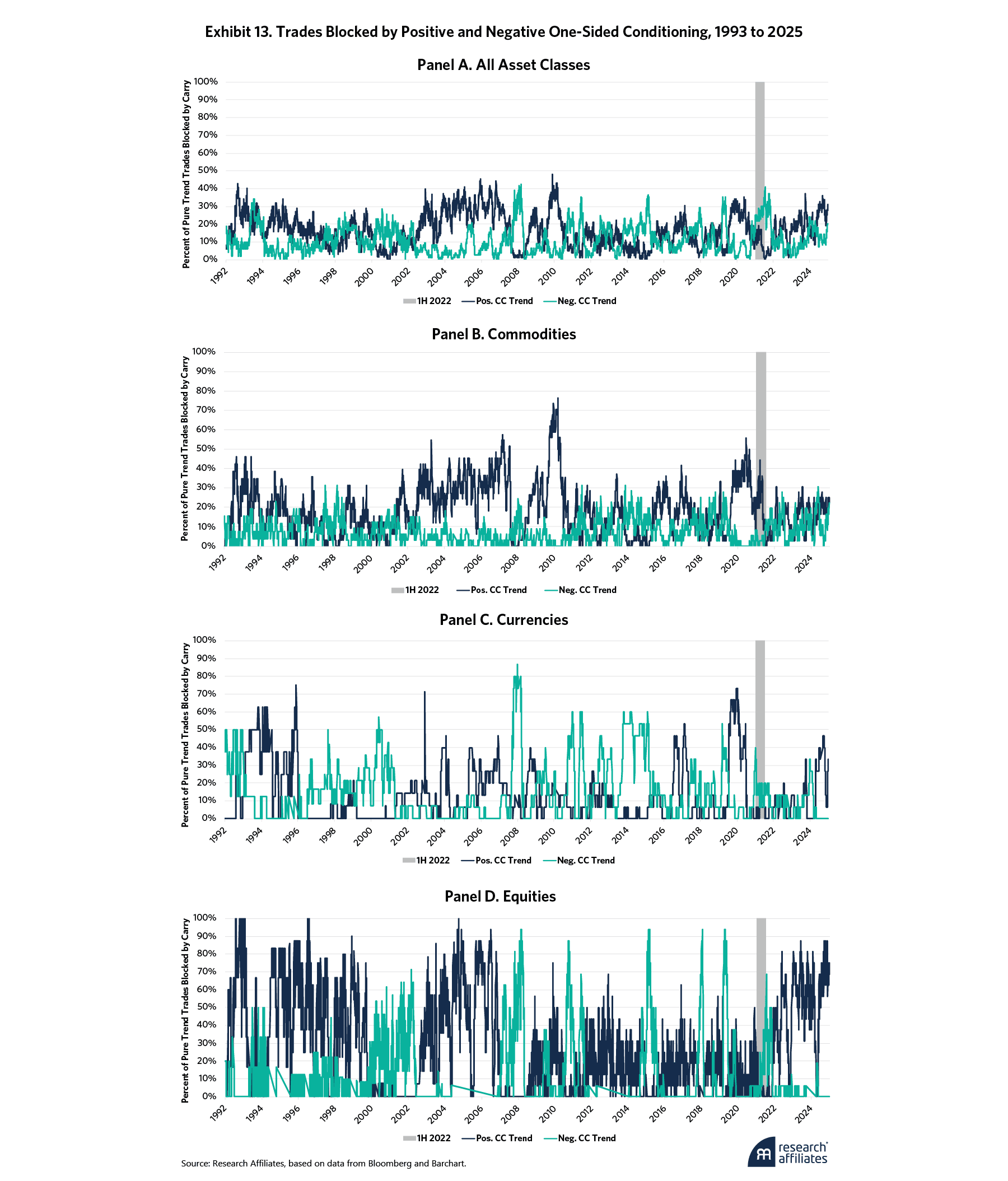 Exhibit 13 shows the percentage of trades that the one-sided carry conditions blocked across all asset classes, as well as for commodities, currencies, and equities. Panel D covers equities and shows the sizeable influence of the low-interest rate environment. Prior to the Great Recession, the positive filter blocked numerous trades based on the generally negative carry posture of equities demonstrated in Exhibit 7. Through the 2010s, the percentage of trades blocked by the positive filter declined precipitously, only to rise again as global interest rates started to rise in late 2021 and early 2022. The negative filter, on the other hand, proved its value during the short and infrequent (albeit sharp) drawdowns of the 2010s; by blocking short trades, the filter boosted the trend portfolio since most of these drawdowns reversed and turned into upswings.