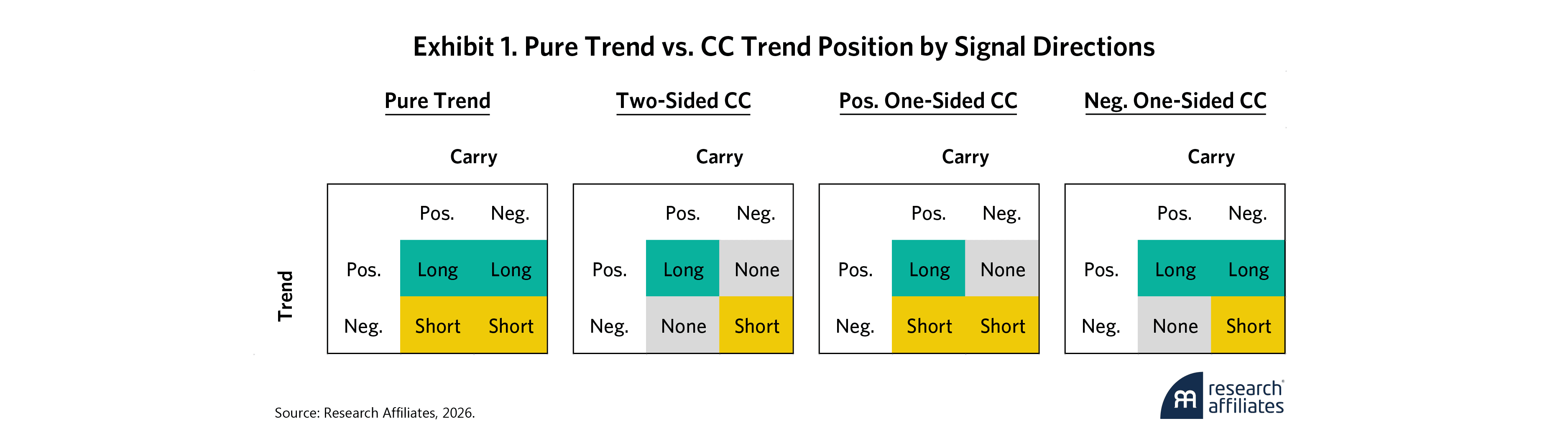What does carry conditioning (CC) mean in the context of a trend following system? Conventional “Pure Trend” strategies take positions in an asset based on the sign and possibly the magnitude of that asset’s trailing return. Exhibit 1’s first table shows how Pure Trend establishes its positions. Now consider what happens when we condition on the sign of an asset’s carry. In the two-sided case, we only take positive (negative) trend positions when they are supported by positive (negative) carry. In the one-sided cases, we only require trend and carry to align on one side of the market (either longs or shorts), while leaving the other side unconstrained.