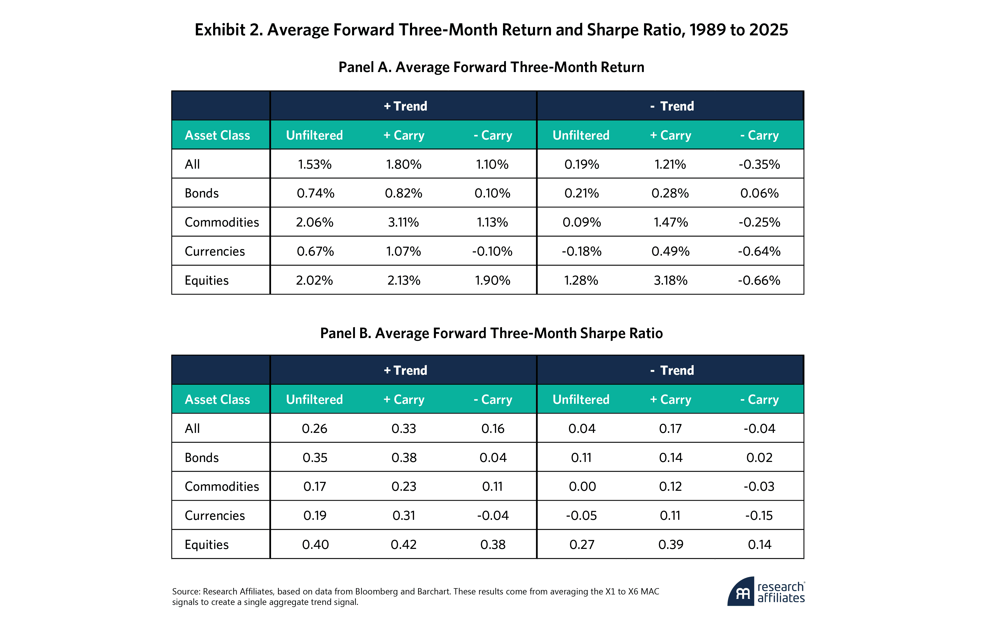 Positive trend paired with positive carry leads to comparatively higher forward returns and Sharpe ratios. Similarly, when trend strategies take short positions, negative trend paired with negative carry delivers lower forward (risk-adjusted) returns.