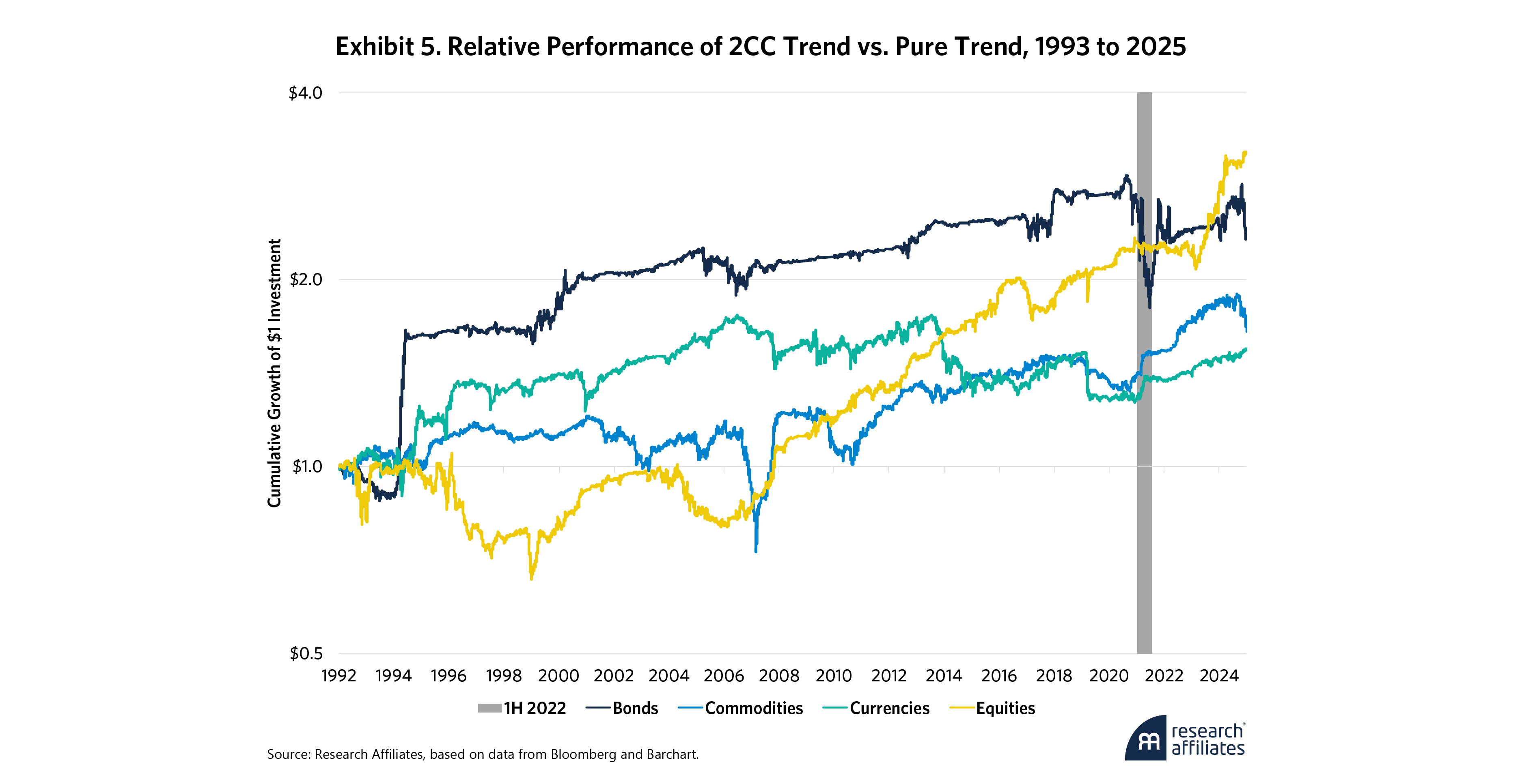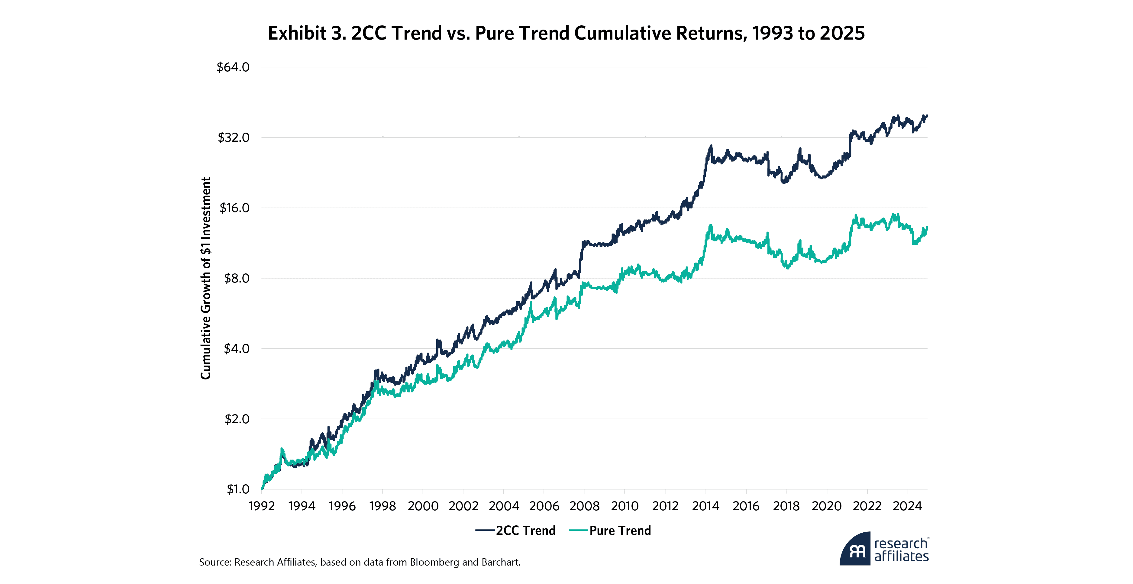 2CC Trend would have mostly missed the precious metals bull market that started in 2024. Moreover, while 2CC Trend restricted shorts as global interest rates fell for 40+ years, thereby boosting its performance in bonds,4 that pattern may or may not continue.